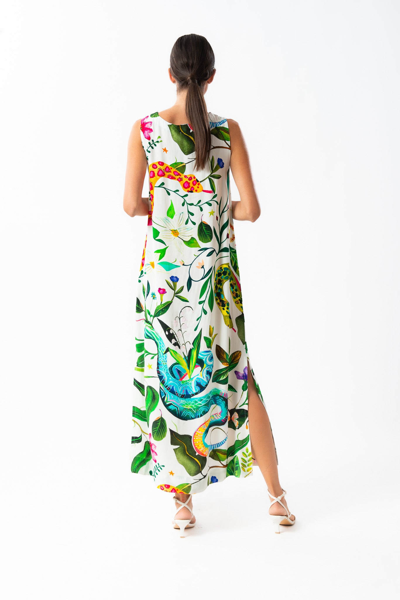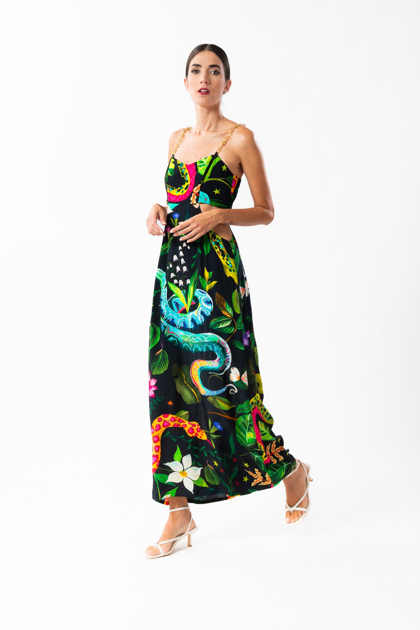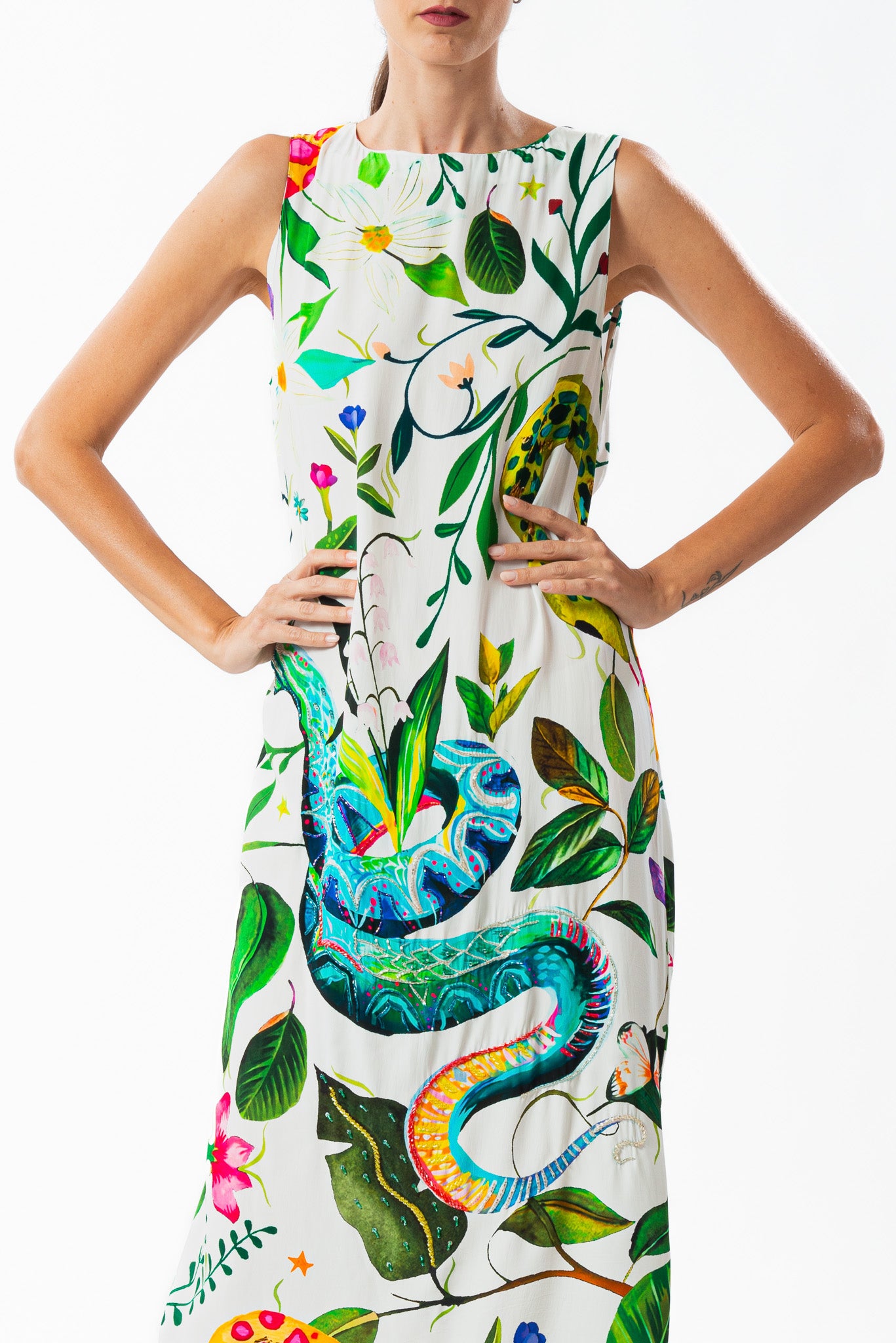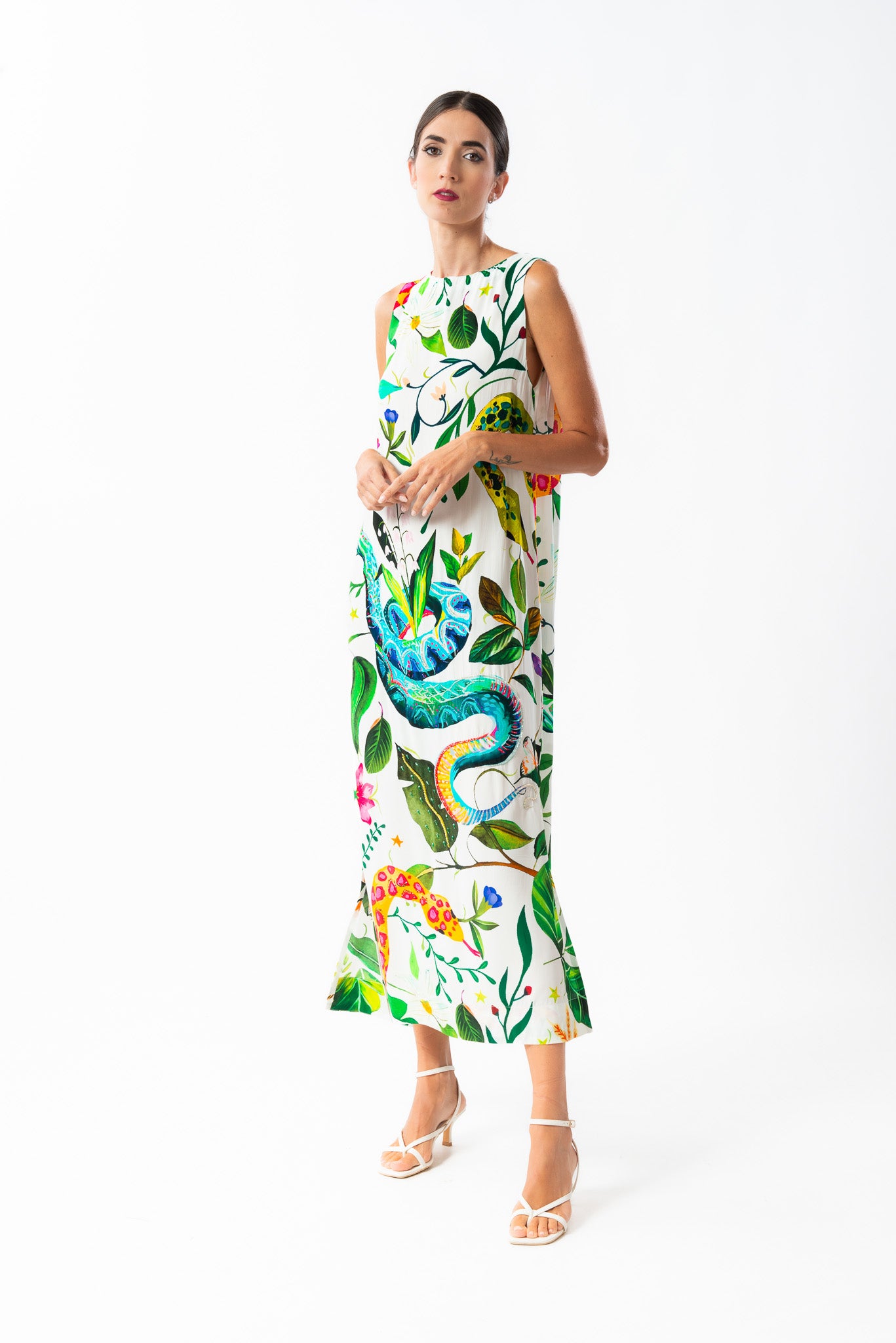 ABITO LUNGO SVASATO CON FIORE RICAMATO