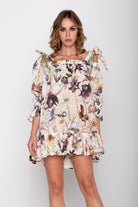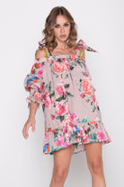 Arricchito da luminosi fili di strass che ne arricchiscono le spalline annodate a fiocco, questo abito largo e corto della serie cotoni, è uno dei mini party dress per eccellenza.