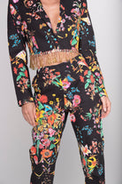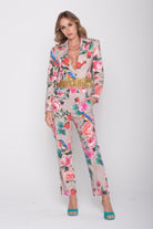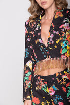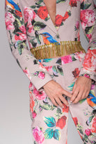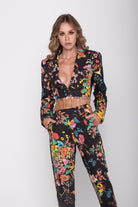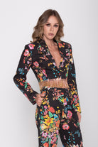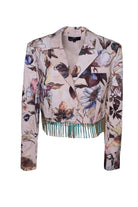 La giacca corta con fili di strass applicati sul fondo che la rendono unica, è un mast-have di questa collezione, perfetta sui pantaloni a sigaretta in cotone, ma bellissima anche indossata con le sete della stessa stampa.