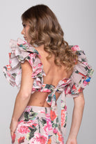Lezioso e versatile il top in cotone annodato sulla schiena e ricche spalline con rouge.