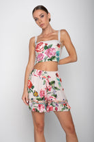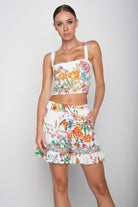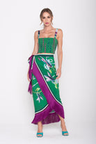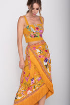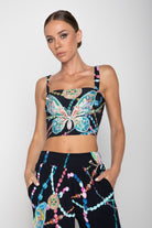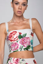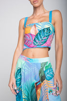 Da indossare su tutti i pantaloni, gli shorts e le due gonne della collezione. Leggerissimo, con spallina larga, lascia la pancia scoperta, ricchi di ricami.