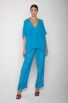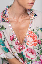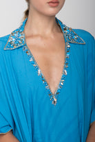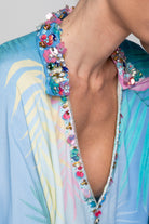 I ricami sul collo sempre ricchi e luminosi la rendono perfetta come completamente di un outfit elegante con il pantalone palazzo o come alternativa al solito e banale copricostume. Bellissima da abbinare ai costumi ricamati della collezione.