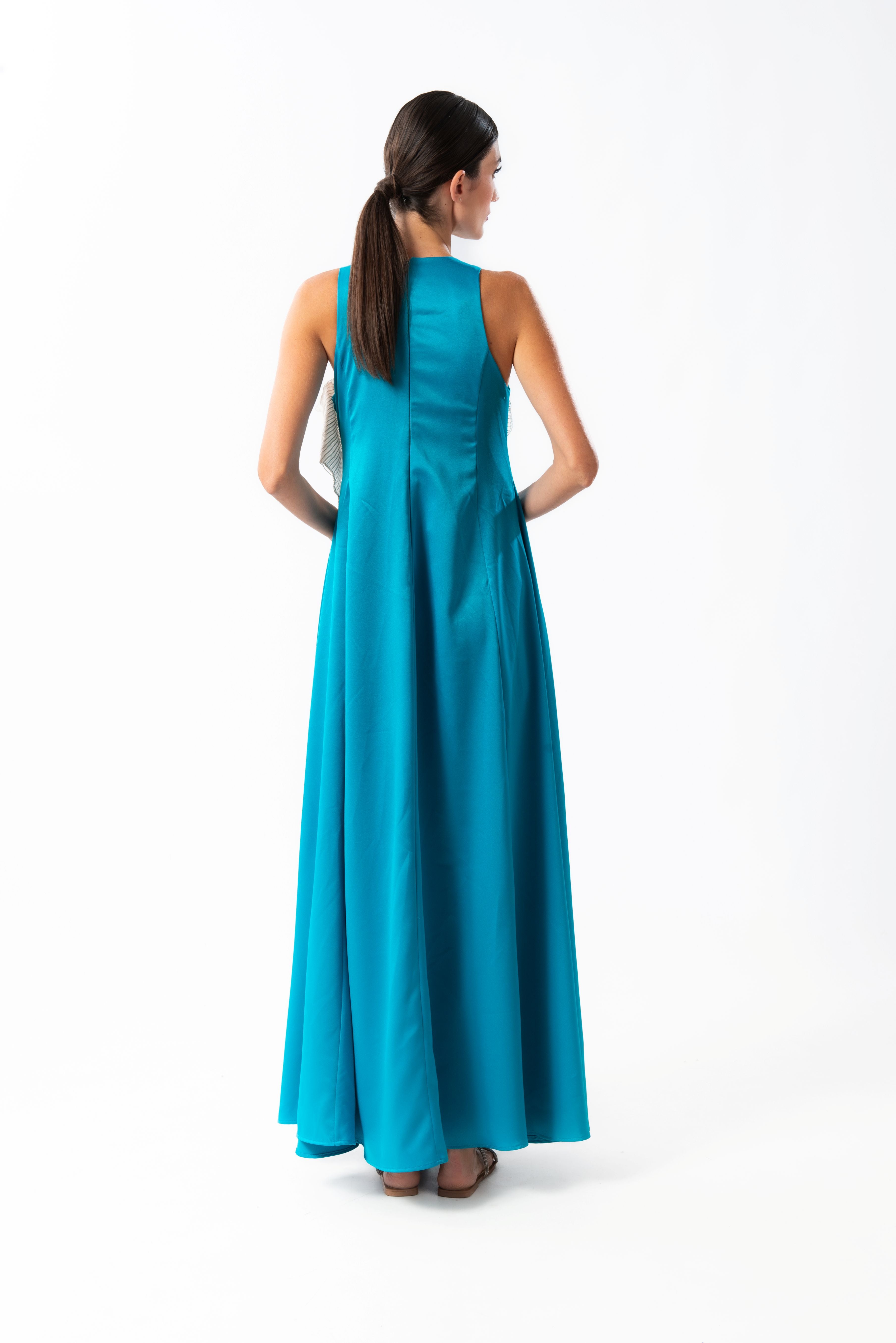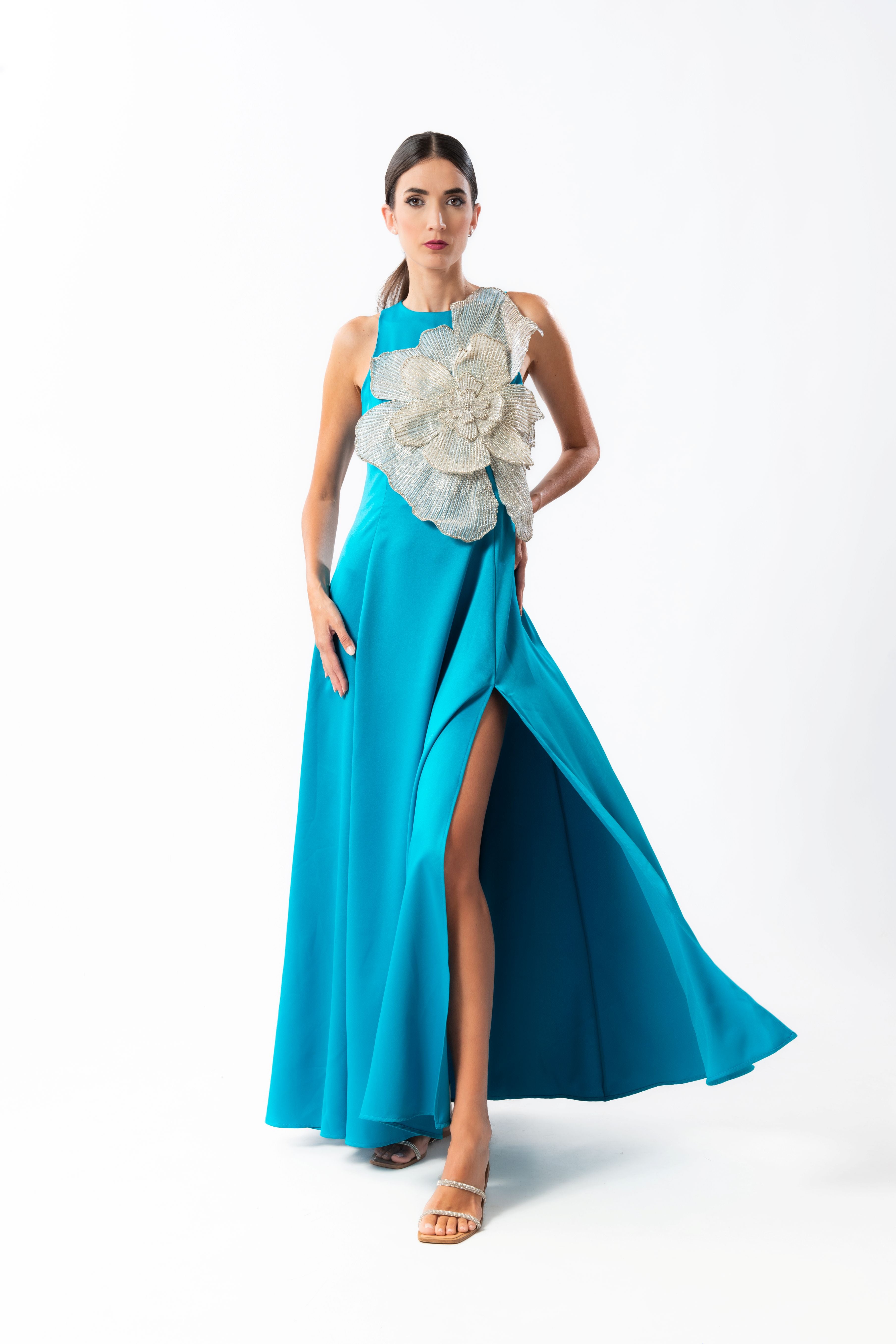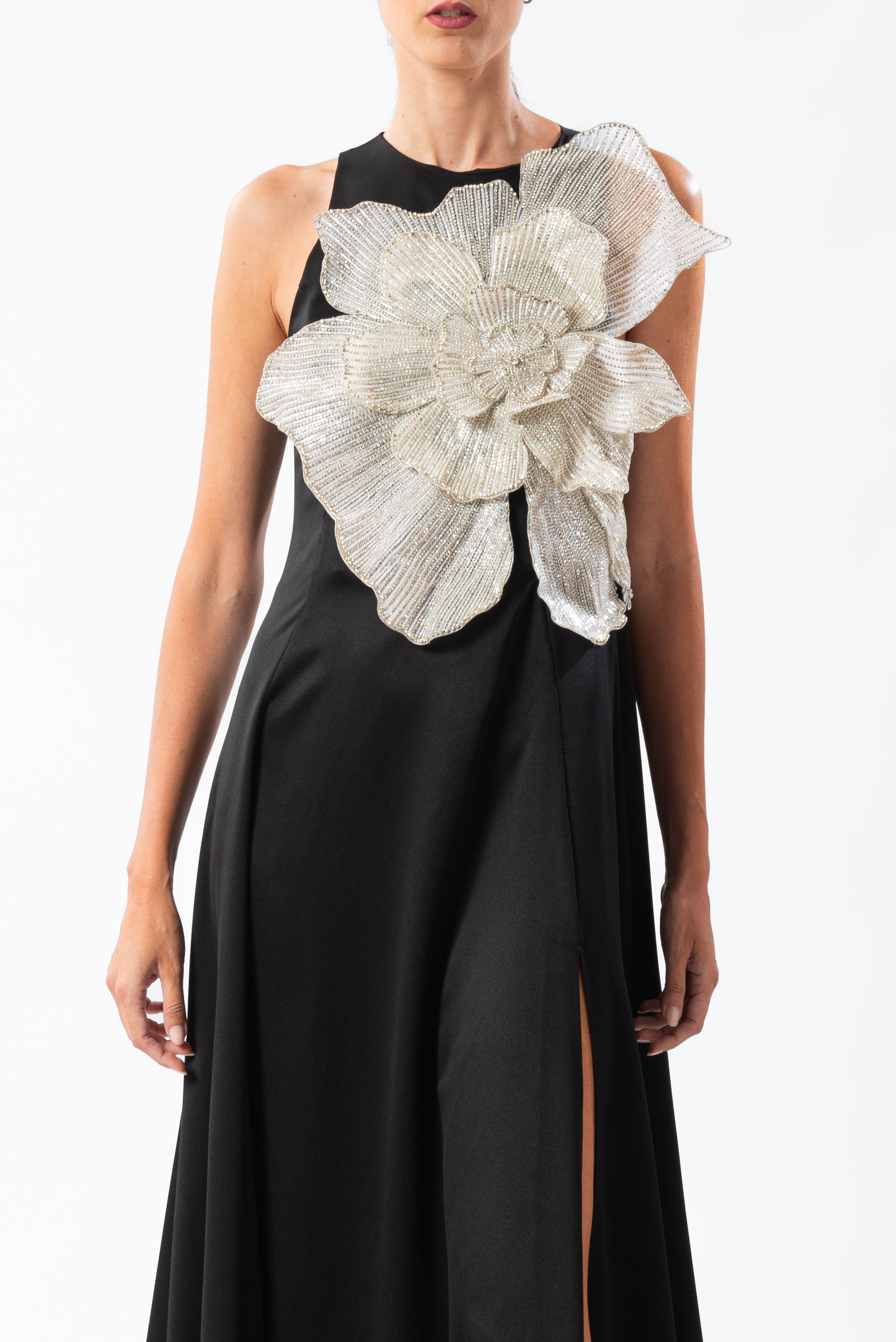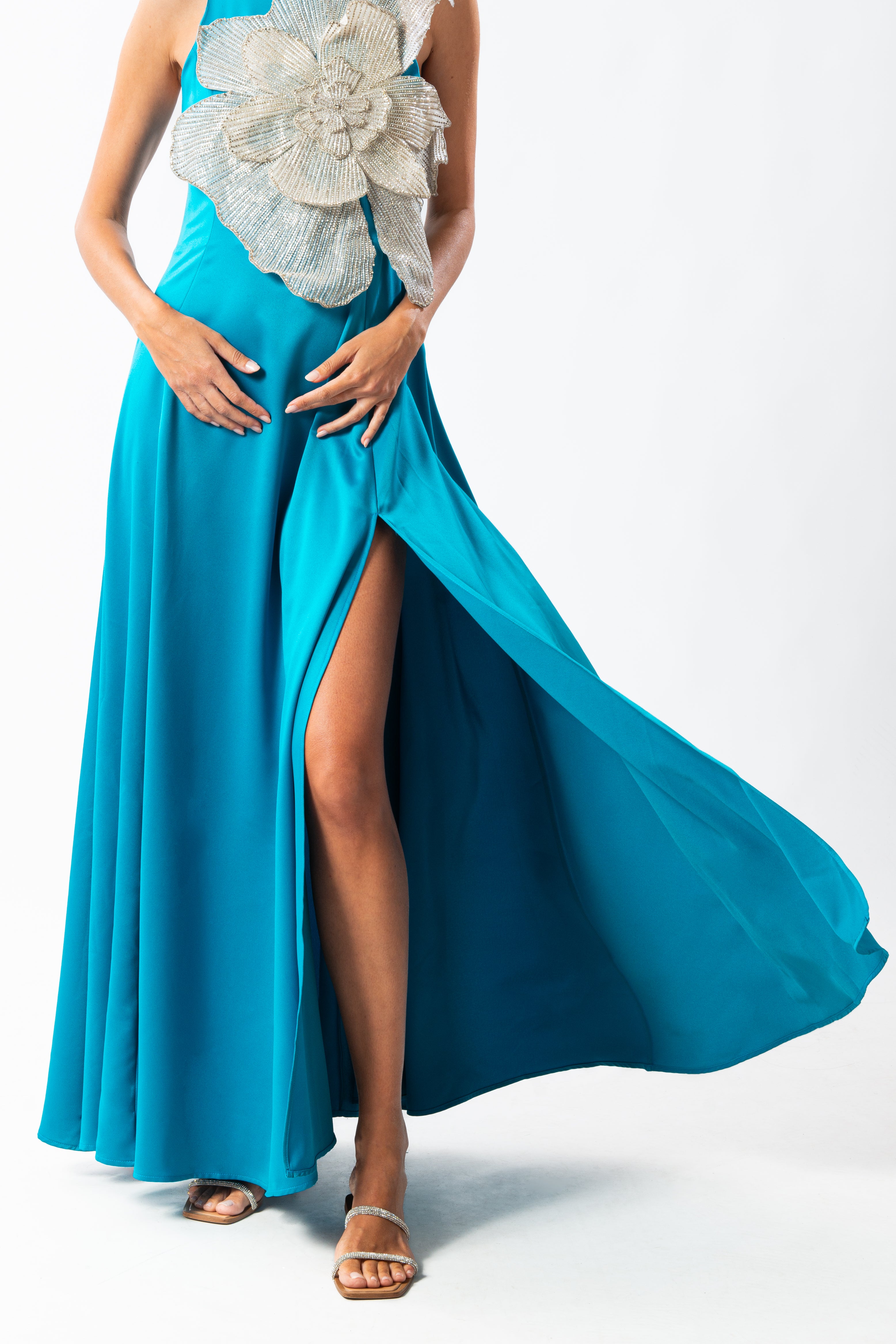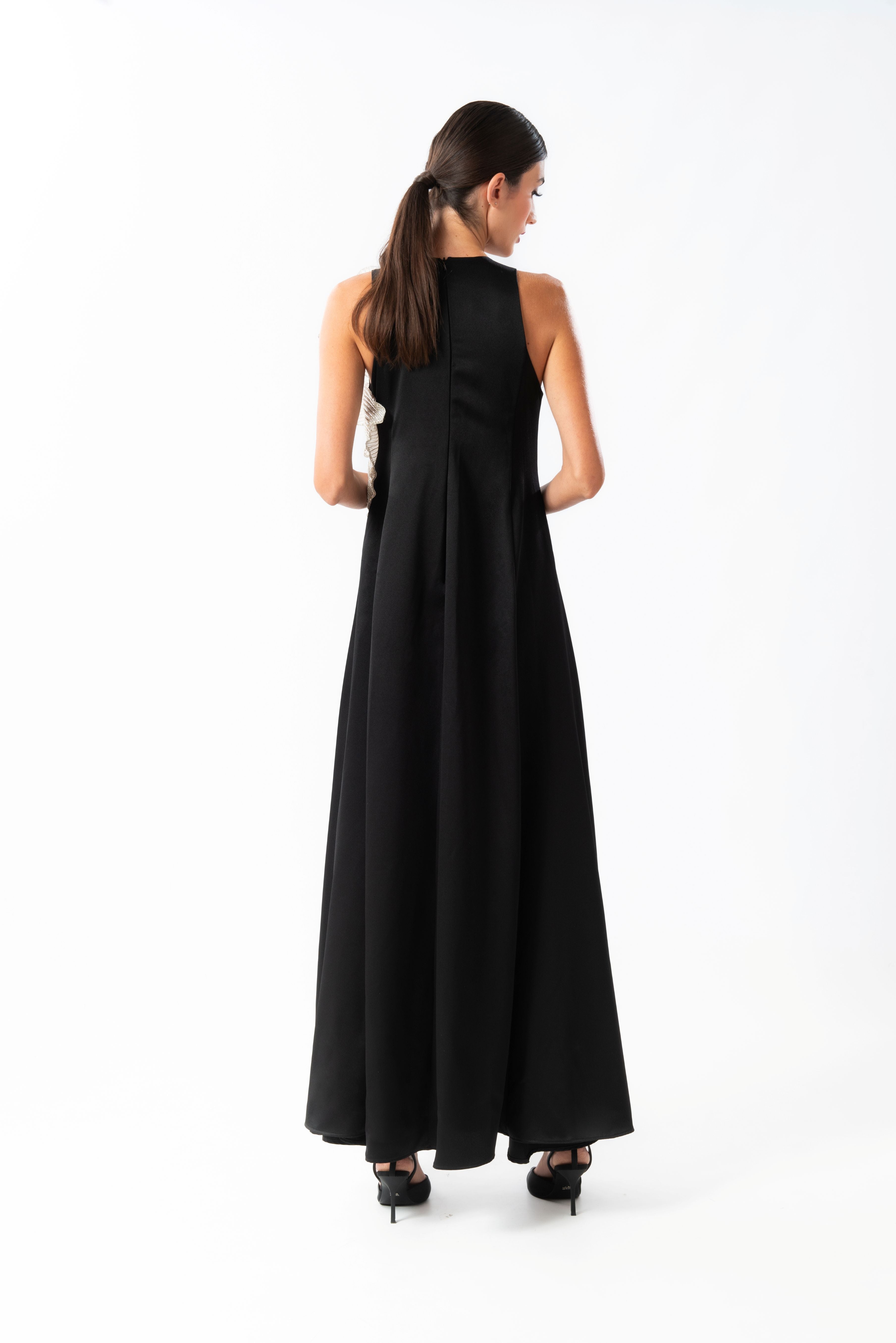 ABITO LUNGO SVASATO CON FIORE RICAMATO