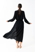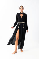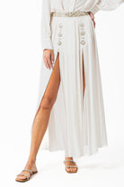 Impreziosita da dettagli gioiello e una linea sofisticata che scivola armoniosamente lungo la silhouette, la gonna dona un effetto fluido e armonioso. Ricami e applicazioni valorizzano il punto vita, mentre il taglio svasato e i delicati spacchi frontali aggiungono un tocco di sensualità ed eleganza.
