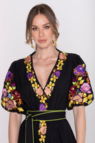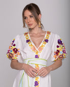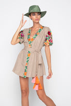L’abito NATASHA, quasi dallo stile "safari", ha i colori della terra. I ricami riempiono le maniche a sbuffo e tutto il bordo della chiusura a portafoglio. Non può mancare anche in questo mini dress, la lunga cintura arricchita da colorate e preziose nappine.