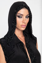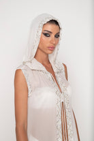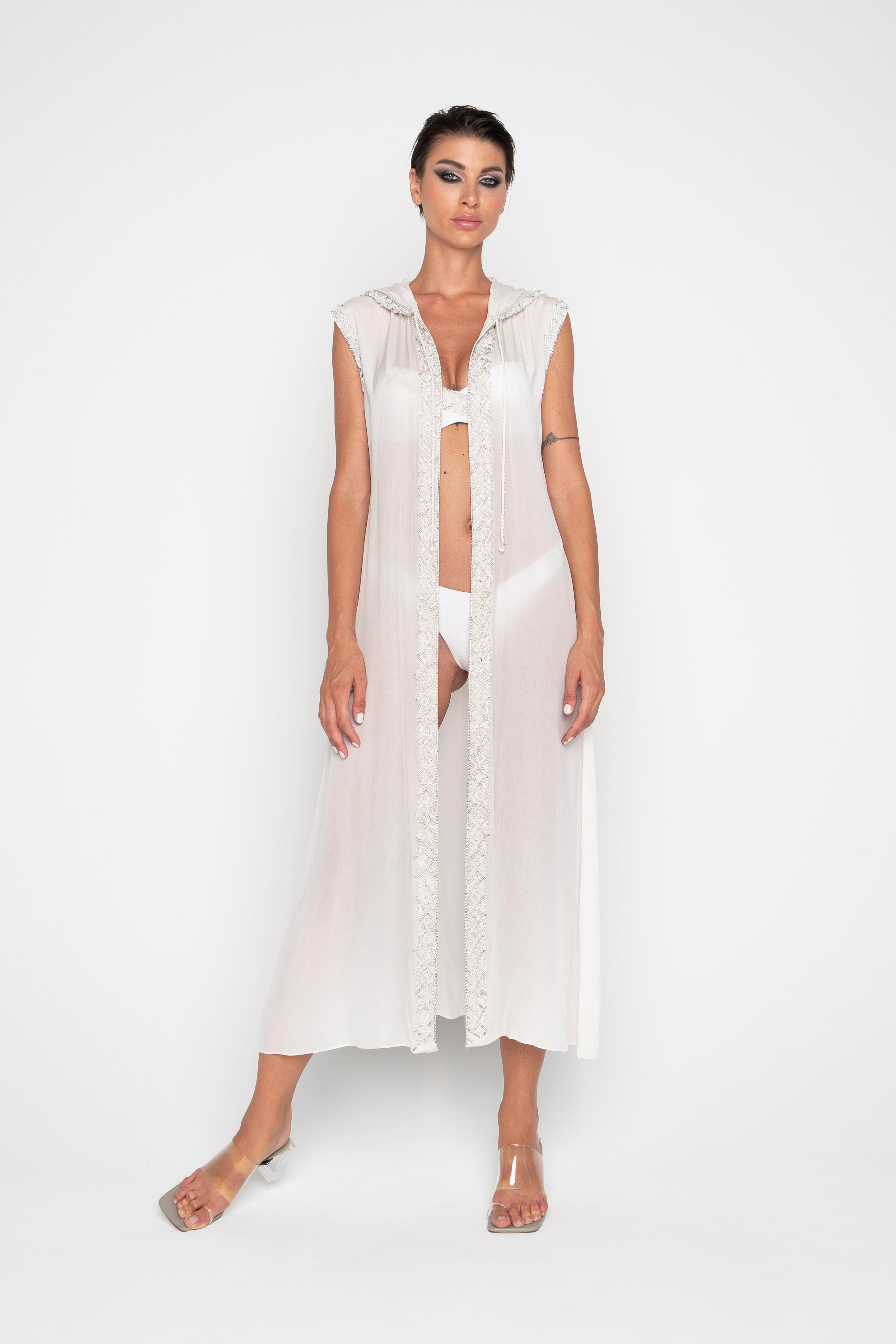 Il gilet lungo kimono con cappuccio, è forse il capo più prezioso della collezione. In spiaggia come ricco e fantastico copricostume, che trovi della stessa fantasia, per non passare inosservata e sentirsi unica.