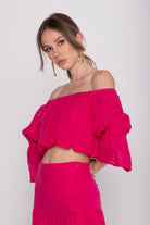 Top INNA e gonna ULKAA, assolutamente da indossare insieme, nei colori caldi del ruggine e del fucsia. Il lino quasi grezzo lo rende un capo grintoso ma nello stesso tempo facile e sportivo. Il top a molla scopre le spalle e veste le braccia con le maniche a sbuffo.