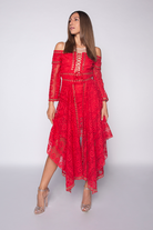 Party dress asimmetrico in pizzo rosso, unica versione.
