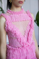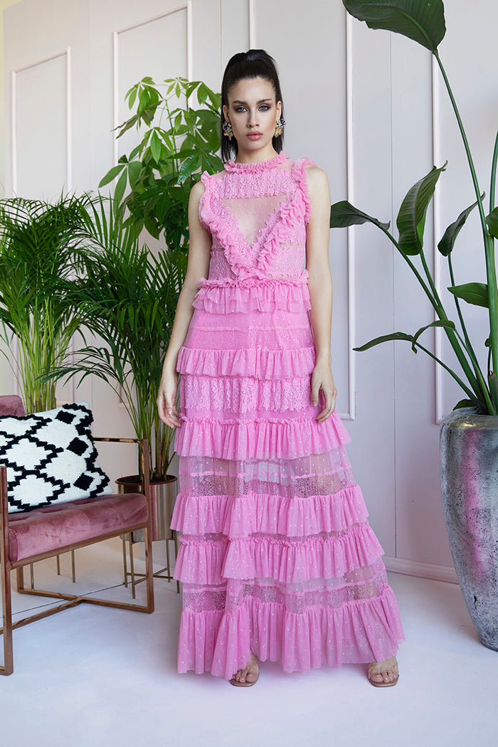 100% tulle rosa per l'abito lungo e smanicato Shalana, unica versione.