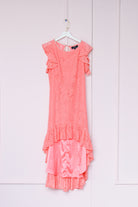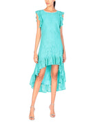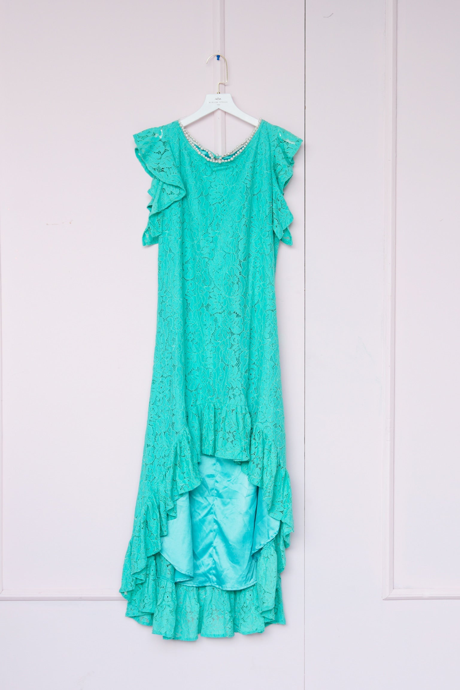 È estate piena con questo abito lungo asimmetrico, 100% pizzo colorato, e collo rifinito con piccole perle.