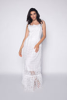 Abito lungo completamente in pizzo macramè, smanicato, foderato fino alla lunghezza midi. Unica versione total white. Perfetto per un party in spiaggia.