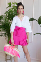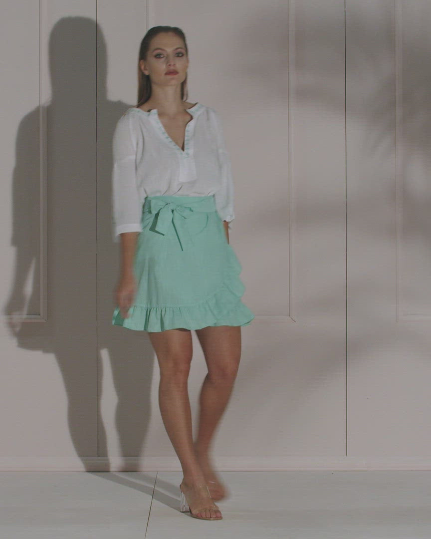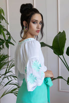 Camicia 100% cotone, con manica corta a sbuffo, delicatamente ricamata nei colori Tiffany, fuxsia o nero.