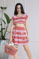 Romantico completo con minigonna e top, interamente all'uncinetto.