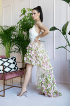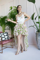 Top in seta leggerissimo con sottili bretelline, nato abbinato alla gonna asimmetrica in strati di tulle con applicazioni floreali in chiffon e foglie ricamate. Chiusura invisibile dietro.