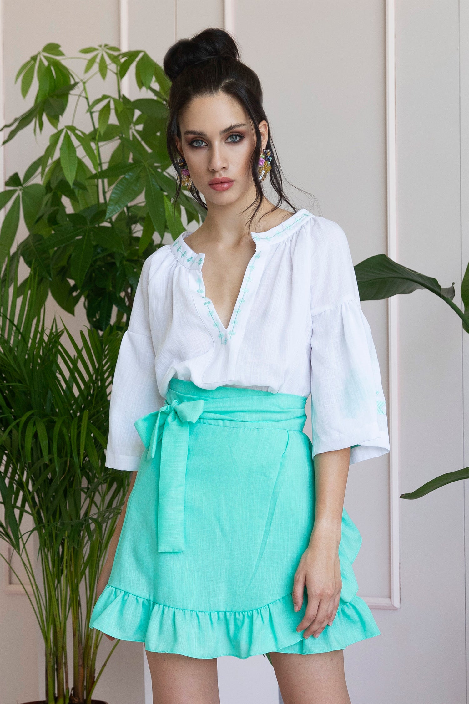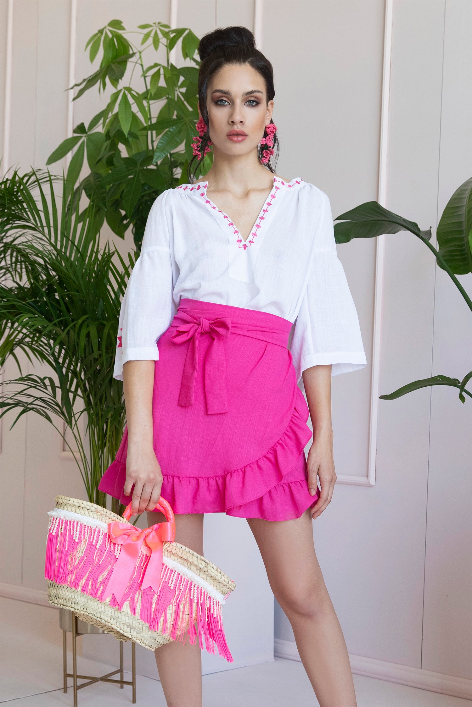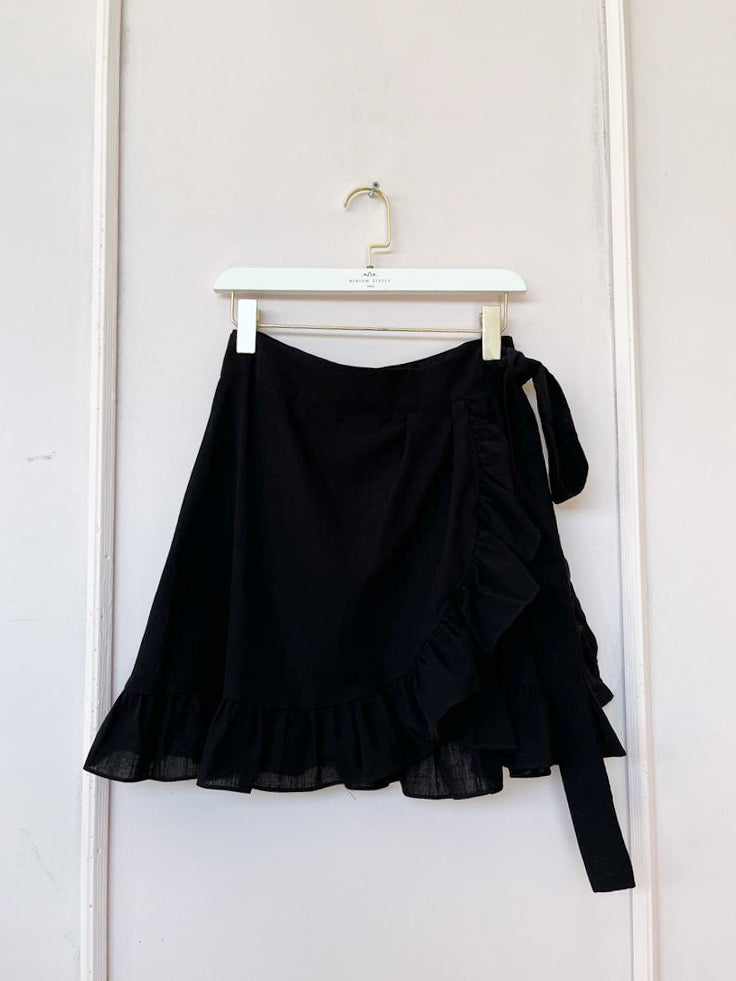Mini gonna 100% cotone con chiusura a portafoglio che la rende comoda da indossare.