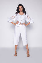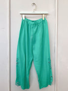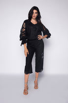 Pantalone 100% lino, con molla in vita. Lunghezza Midi, pratica e arricchita da ricami ad intaglio floreale.