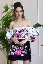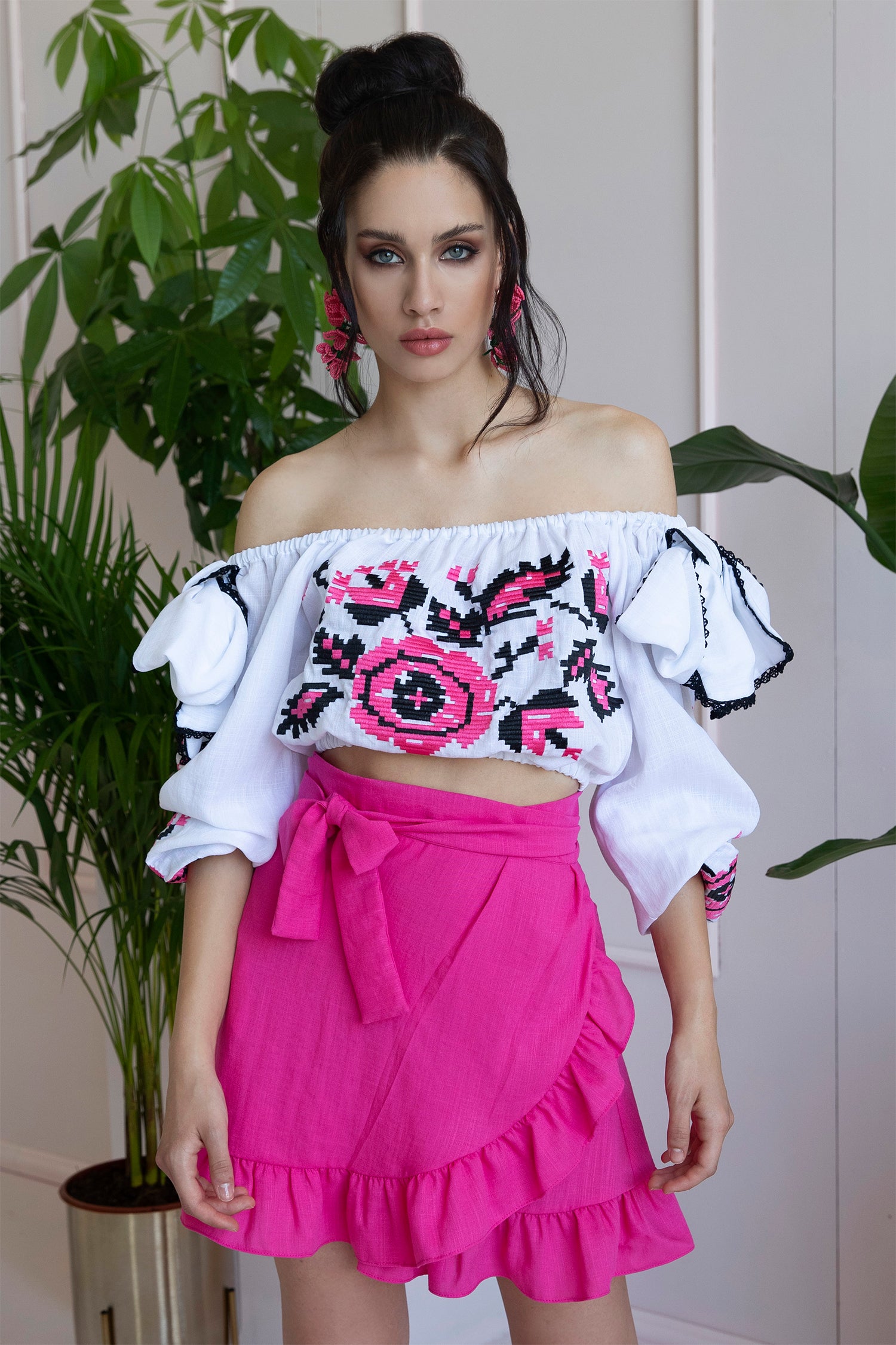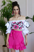 Top corto 100% cotone arricciato, con spalle scoperte, arricchite da fiocchi bordati in pizzo.