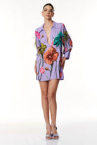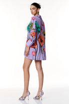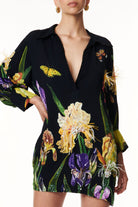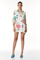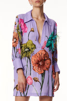 L’abito camicia corto, una fusione di stile moderno e dettagli classici. La linea dritta, lo scollo profondo a V rifinito a mano con minuziose perline e il colletto a punta, aggiungono una nota sofisticata, mentre la stampa floreale arricchita da paillettes, perle, cristalli e piume crea un effetto tridimensionale, trasformando l'intero abito in un capolavoro di moda.