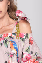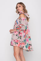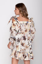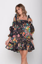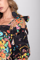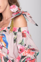 Arricchito da luminosi fili di strass che ne arricchiscono le spalline annodate a fiocco, questo abito largo e corto della serie cotoni, è uno dei mini party dress per eccellenza.