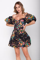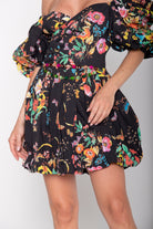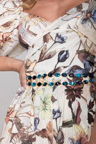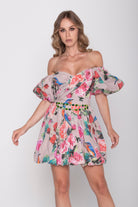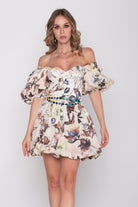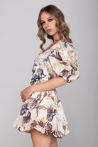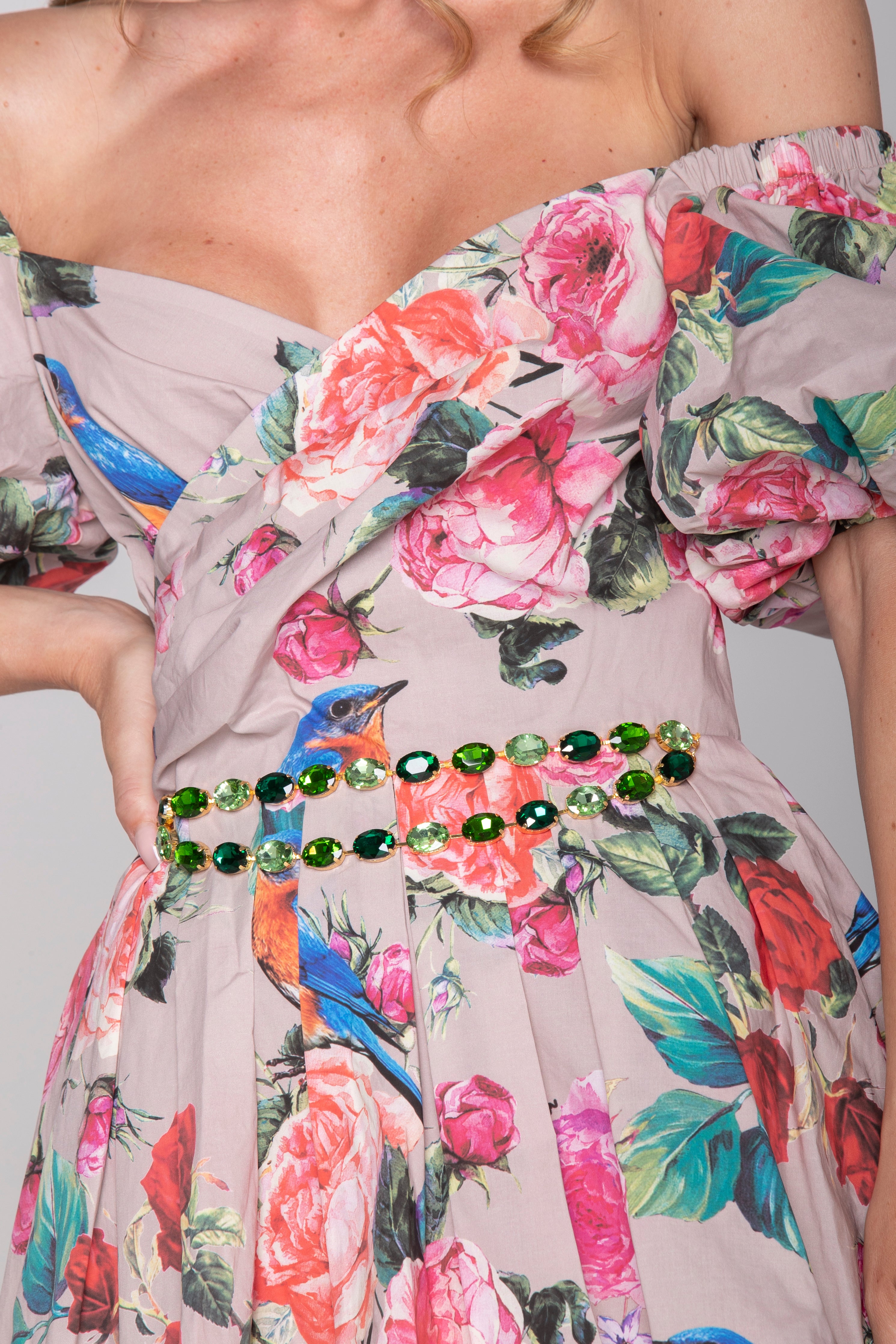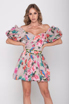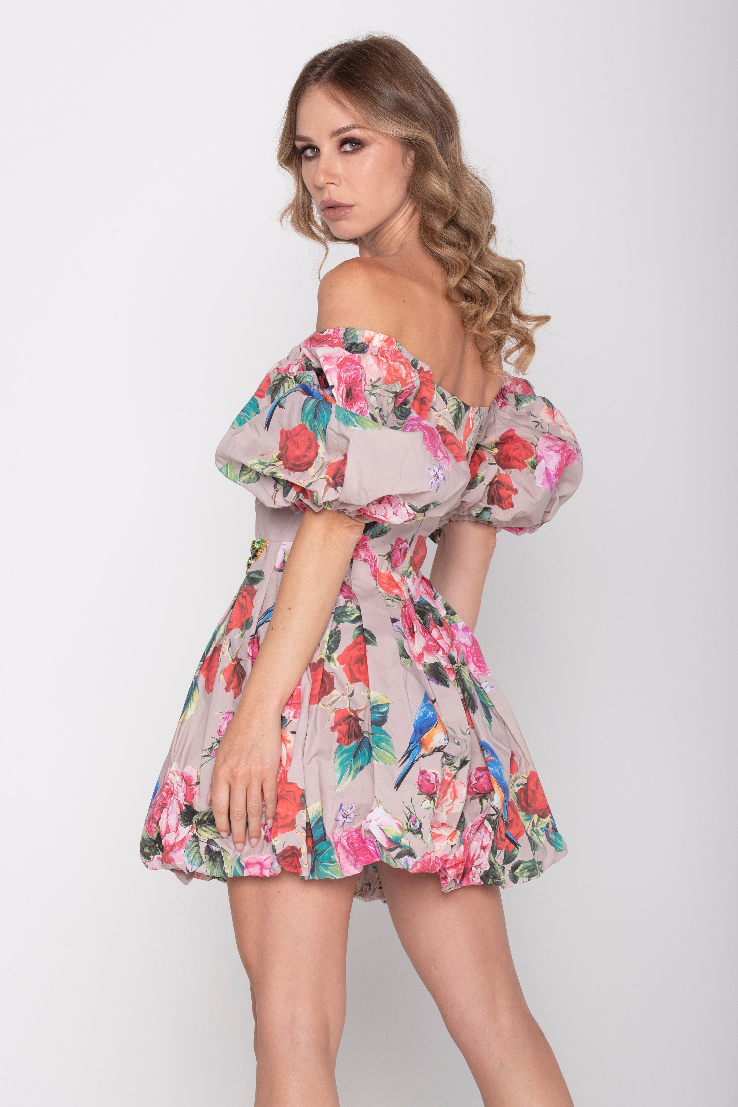 Questo mini abito a palloncino, con maniche a sbuffo e cintura di cristalli applicata, è adatto alle più giovani clienti Miriam Stella.