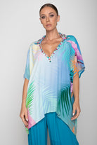 I ricami sul collo sempre ricchi e luminosi la rendono perfetta come completamente di un outfit elegante con il pantalone palazzo o come alternativa al solito e banale copricostume. Bellissima da abbinare ai costumi ricamati della collezione.