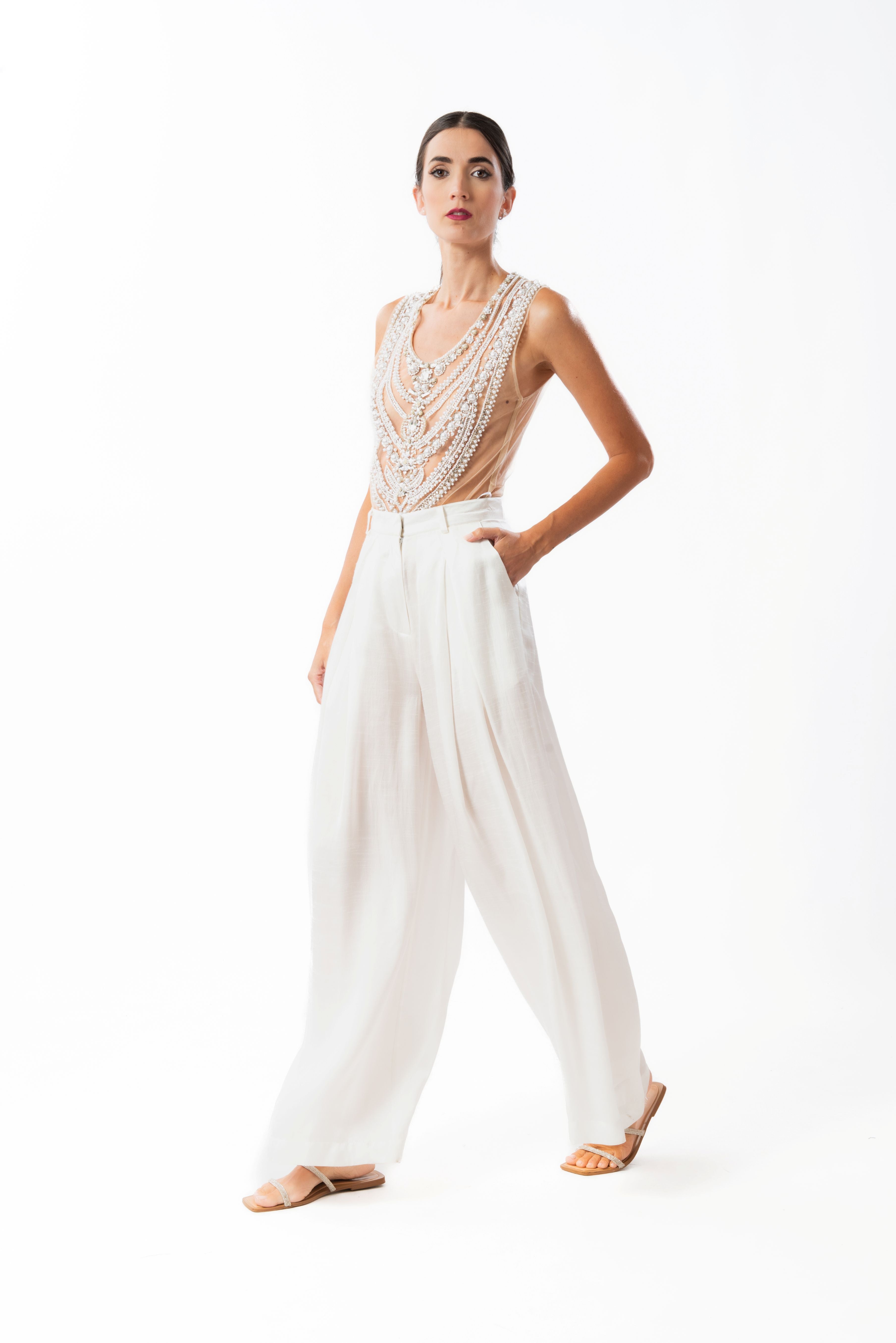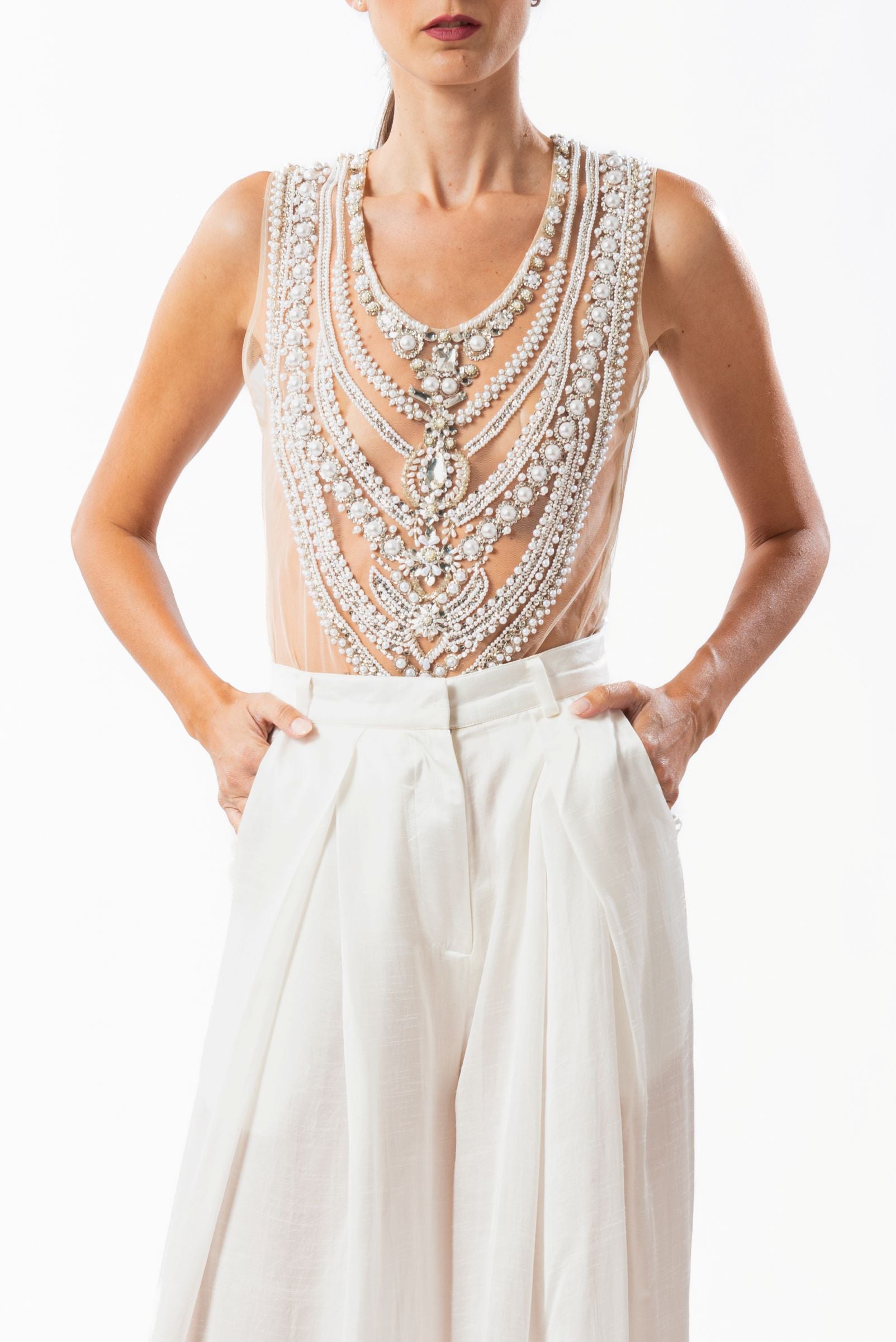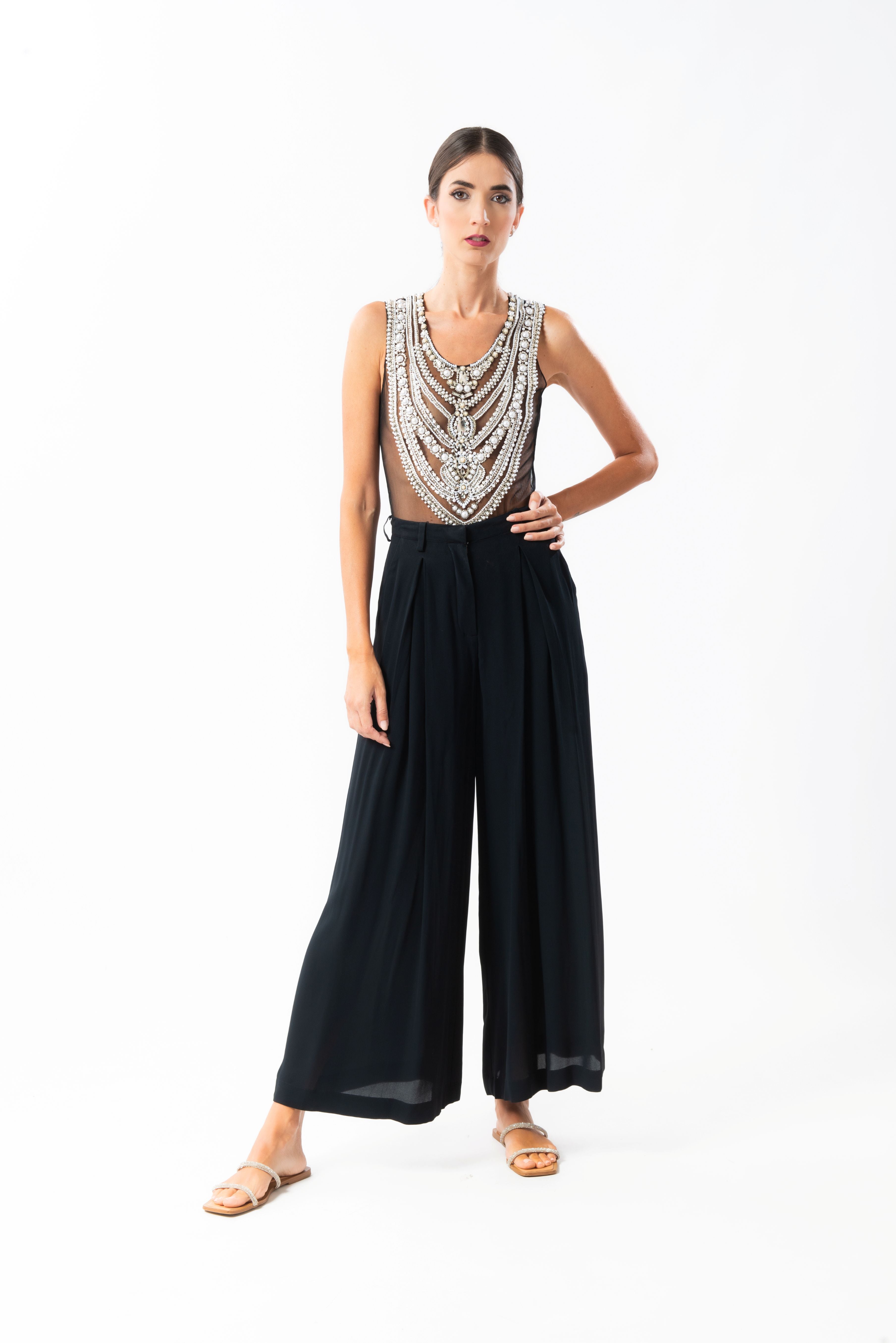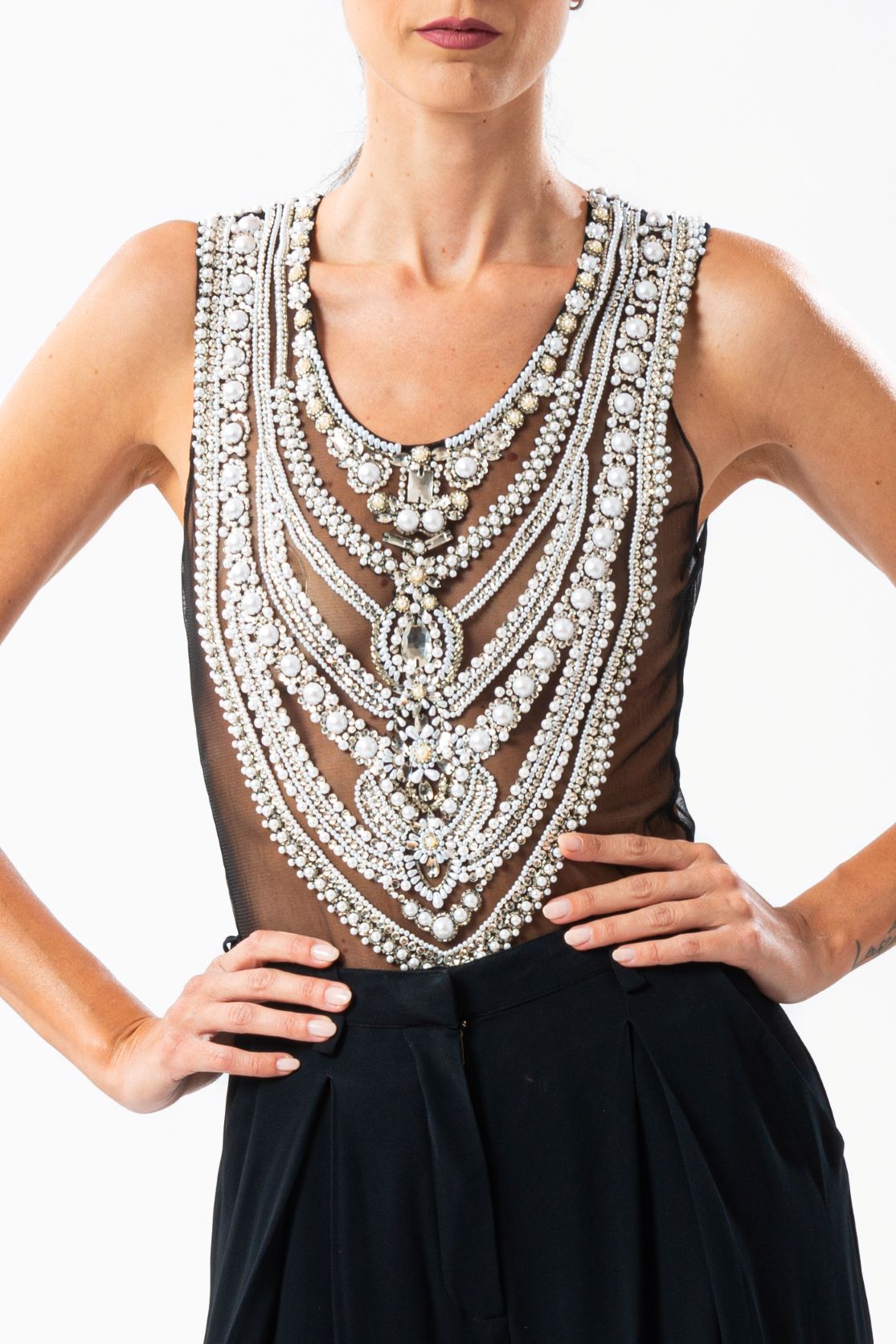 Un capo che incarna l'eleganza audace e la raffinatezza assoluta. Questo body è una vera opera d’arte sartoriale, pensato per chi desidera brillare con uno stile sofisticato e seducente. L’effetto vedo-non-vedo del tessuto trasparente si unisce a una cascata di ricami gioiello, dando vita a un look magnetico e senza tempo. La struttura smanicata con scollo profondo enfatizza il décolleté con un design avvolgente e bilanciato.