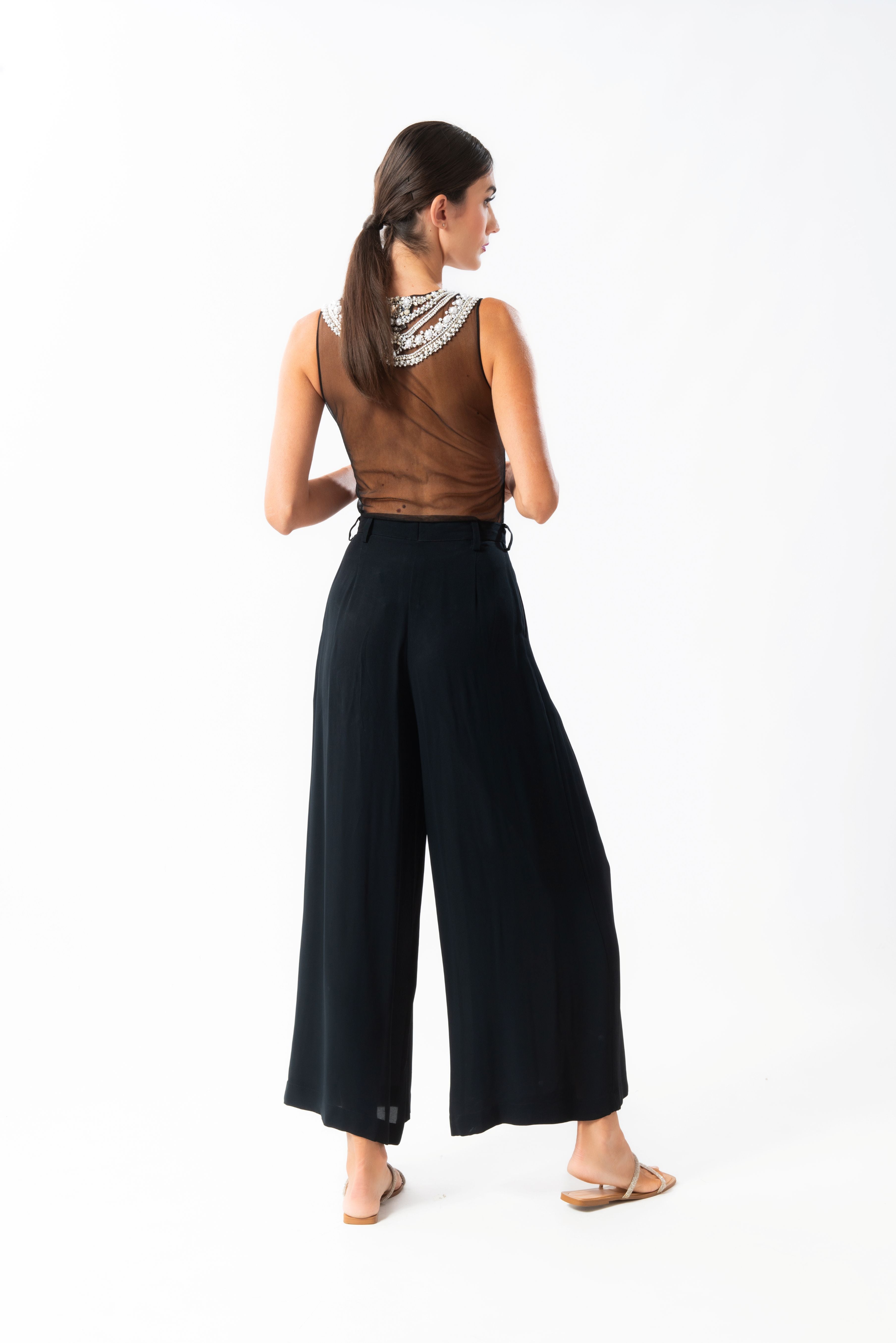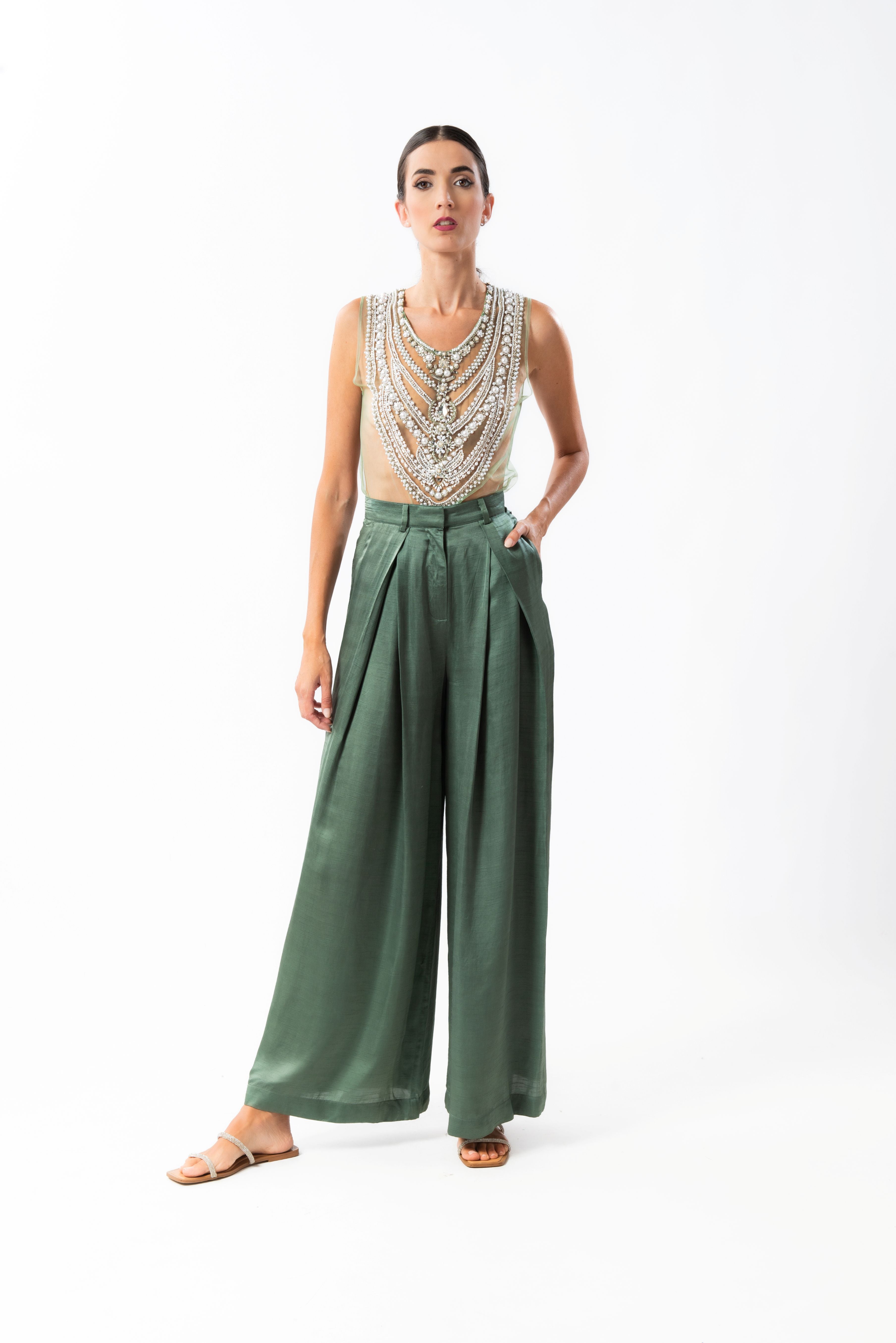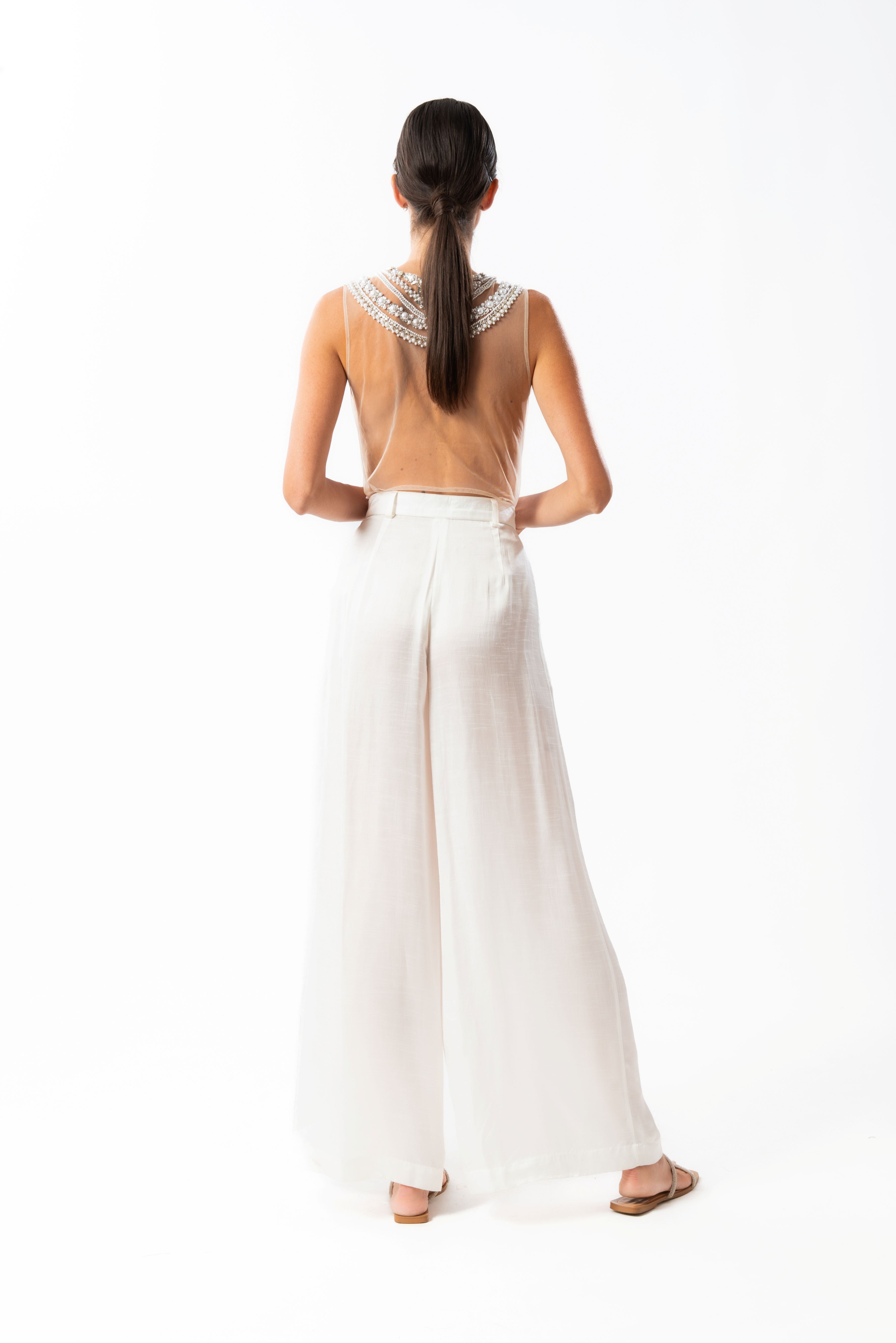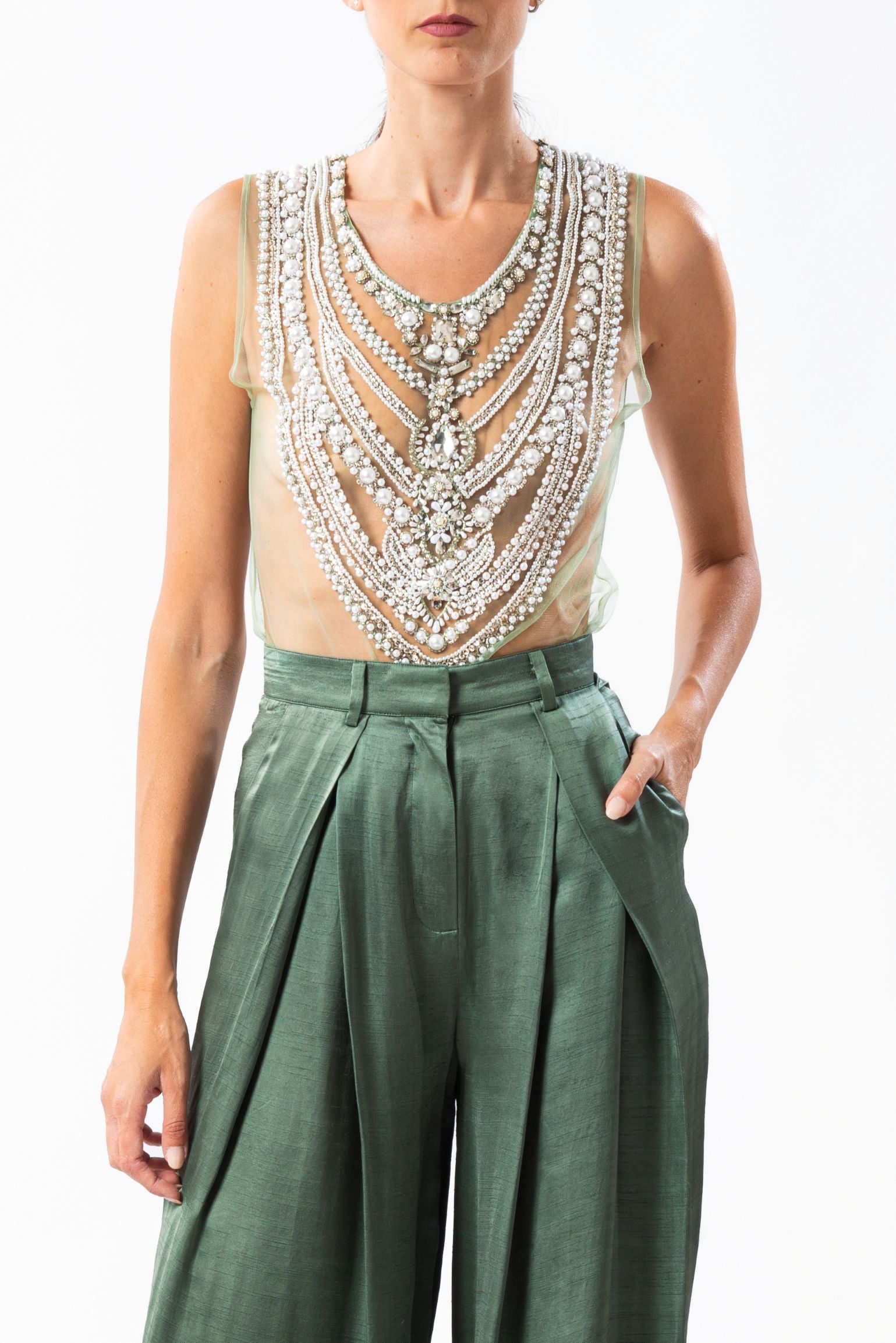 Un capo che incarna l'eleganza audace e la raffinatezza assoluta. Questo body è una vera opera d’arte sartoriale, pensato per chi desidera brillare con uno stile sofisticato e seducente. L’effetto vedo-non-vedo del tessuto trasparente si unisce a una cascata di ricami gioiello, dando vita a un look magnetico e senza tempo. La struttura smanicata con scollo profondo enfatizza il décolleté con un design avvolgente e bilanciato.