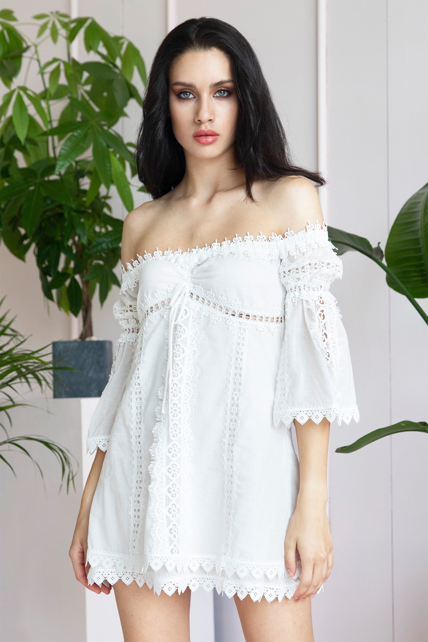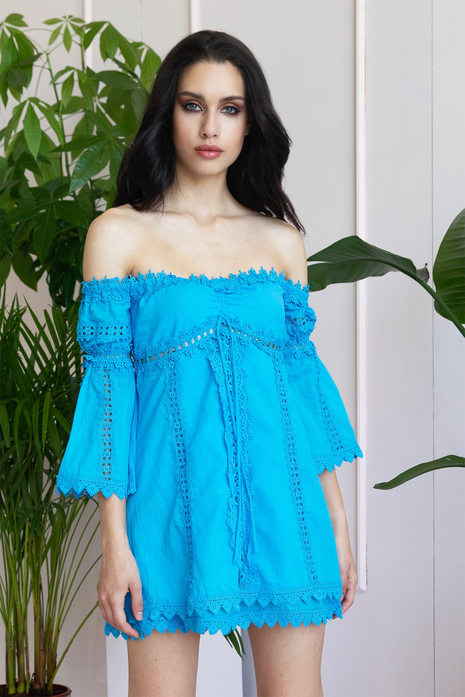 This dress is among the best sellers of the Miriam Stella collections. Shoulders bare and adjustable drawstring on the breast. 100% summer!