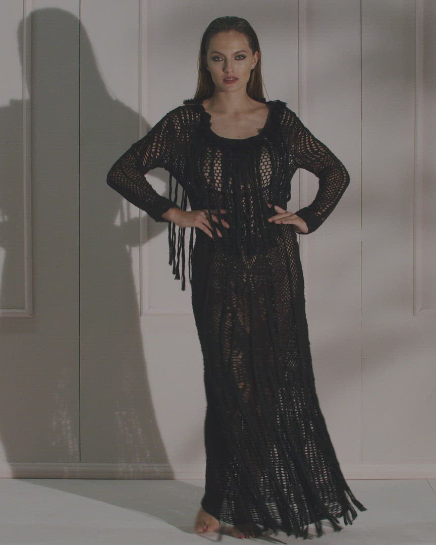 Long crochet dress, unlined, with fringes and tassel on the V-neck of the back. Beautiful as a cover-up, great for a beach party. Available in white and black color.