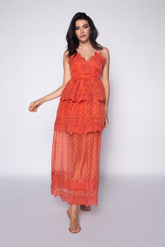 This organza dress, one of the flagship items of the Miriam Stella collections, with the lightness and brightness of organza, enriched by colored lace inserts on color, make the woman who wears it unique and special.