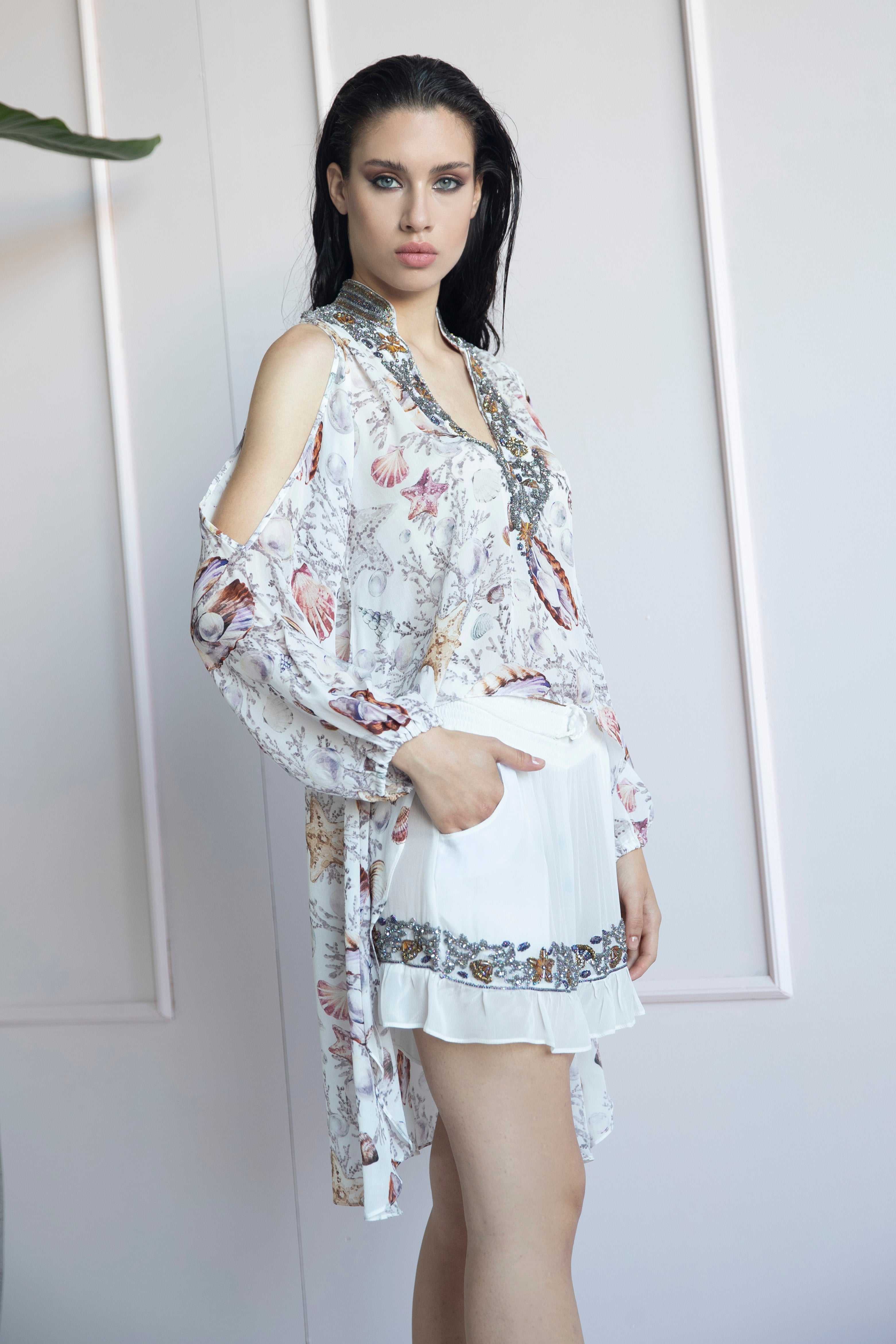 50% silk, 50% viscose, 100% summer with this asymmetrical shirt, from use versatile.