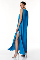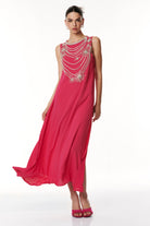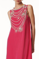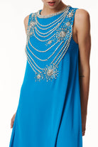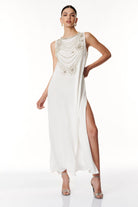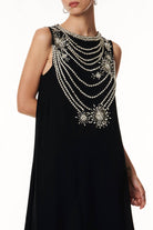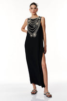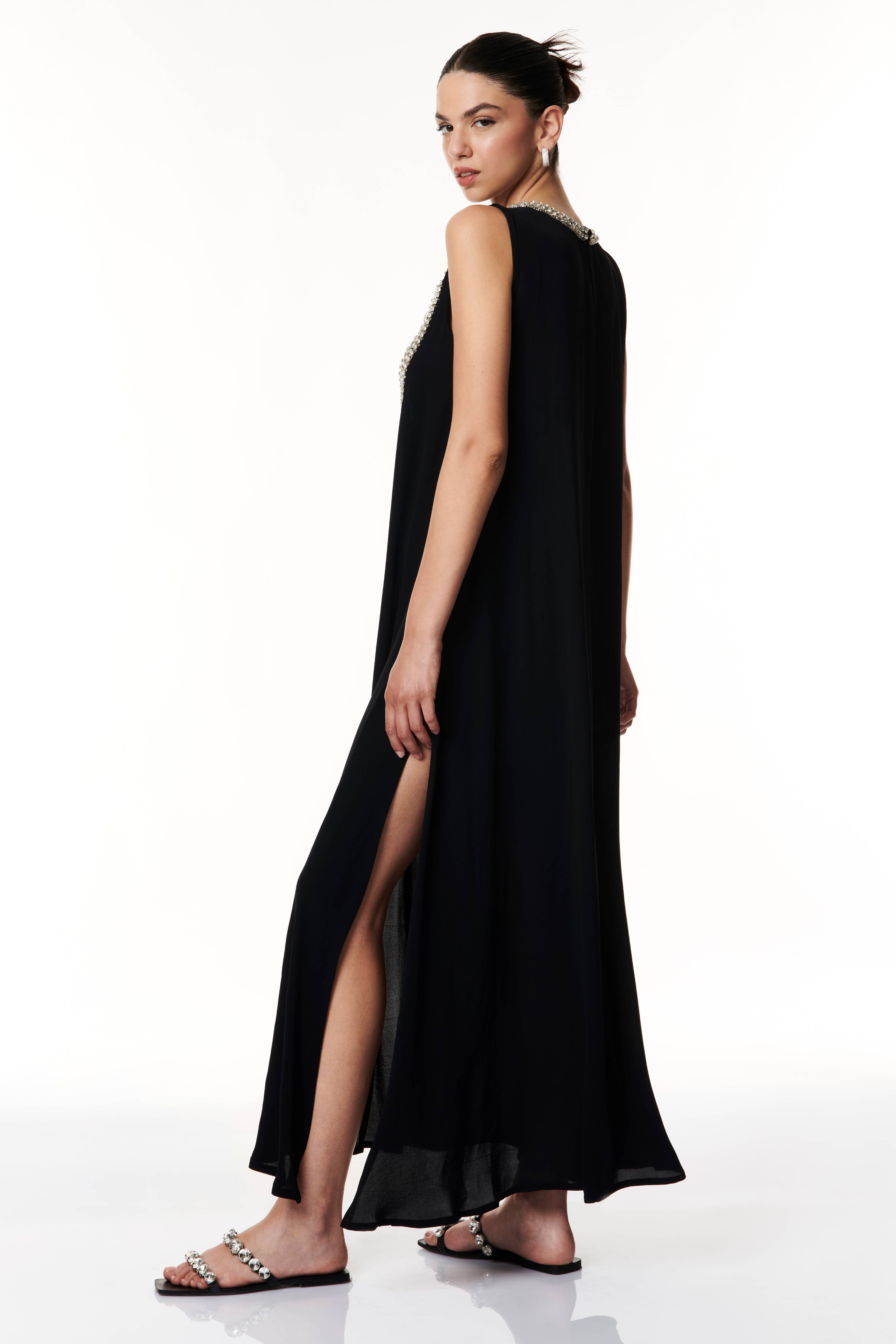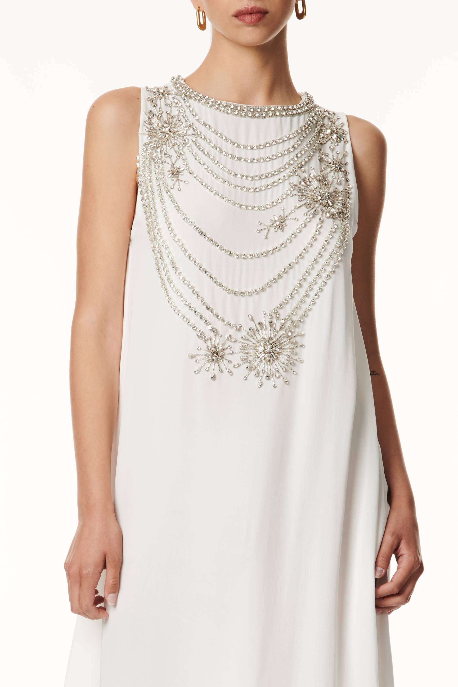 Fili di cristalli intrecciati ed esplosioni di luci sono i ricami che arricchiscono questo affascinante abito lungo. La linea dritta del capo conferisce un'eleganza contemporanea, mentre i dettagli luminosi aggiungono un effetto magico, attirando lo sguardo e aggiungendo uno splendore unico. Lo scollo a barca dona un tocco di raffinatezza e femminilità, evidenziando le spalle e il collo in modo delicato e fine. Lo stile smanicato aggiunge un tocco di freschezza e comfort, permettendo di muoversi con agilità e classe.
