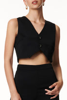 Rinnova il tuo stile con il gilet cropped, un capo versatile e sofisticato che unisce dettagli raffinati a una silhouette moderna. L'abbottonatura monopetto con bottoni di pietre preziose aggiunge un tocco di lusso.