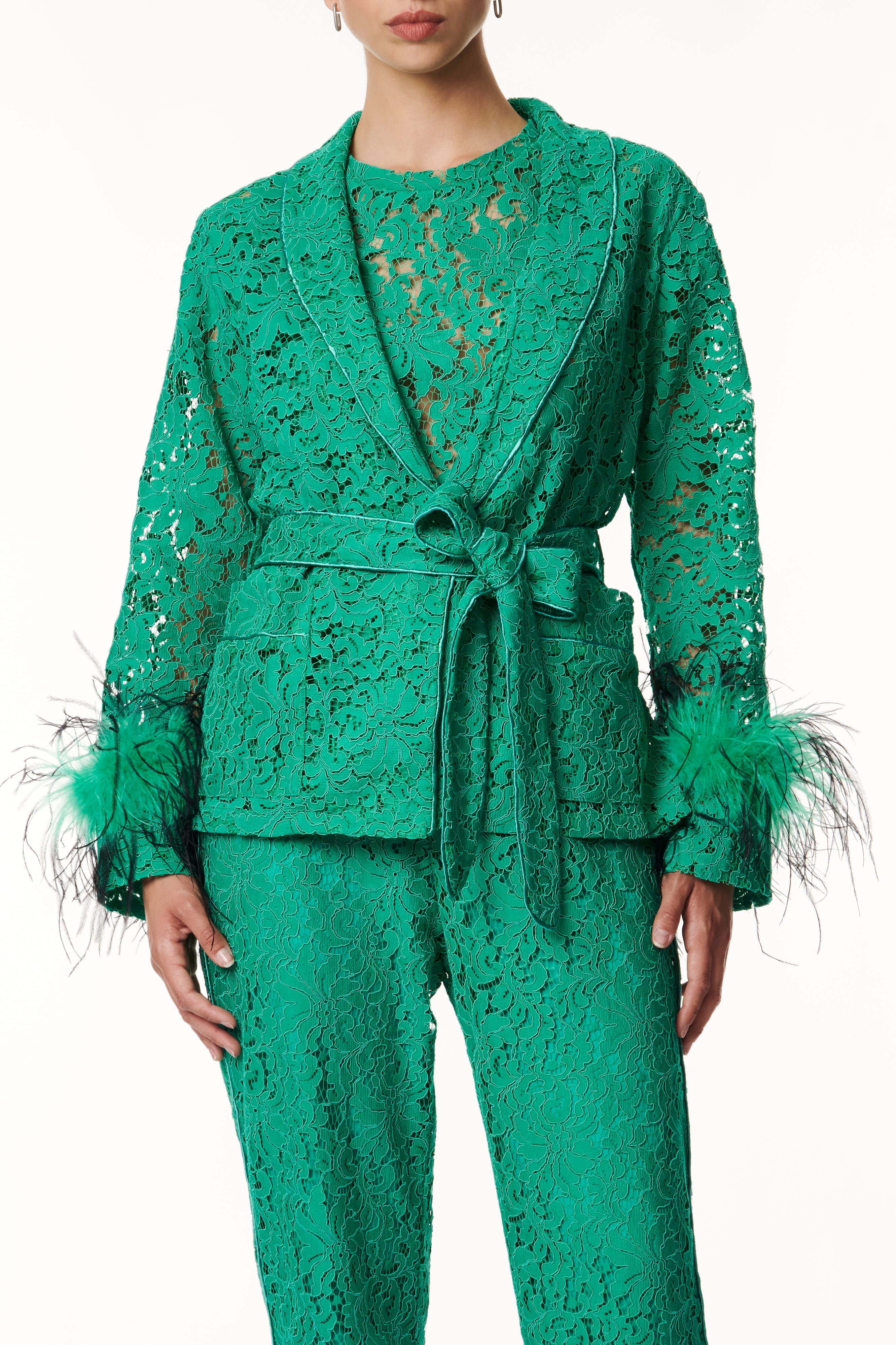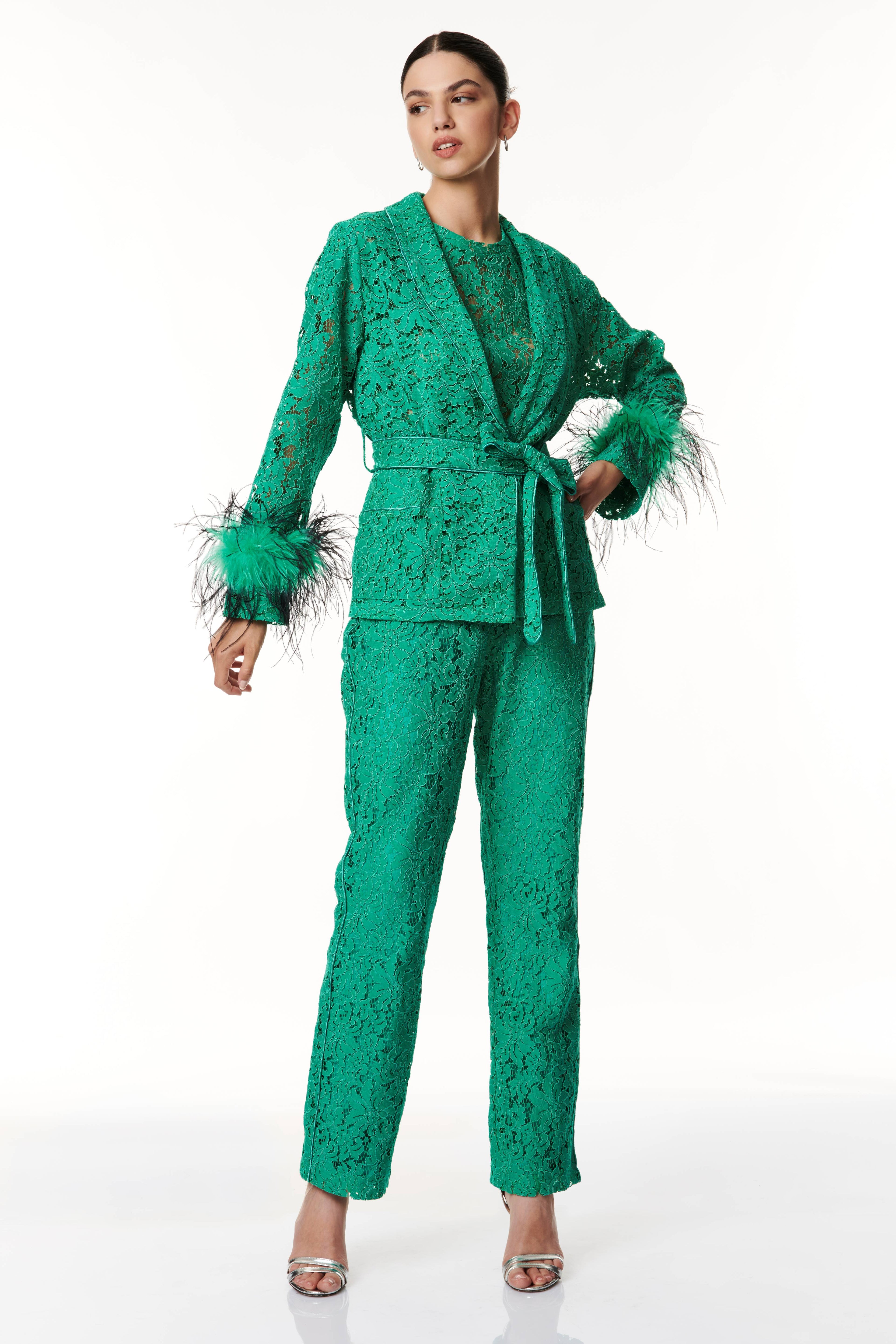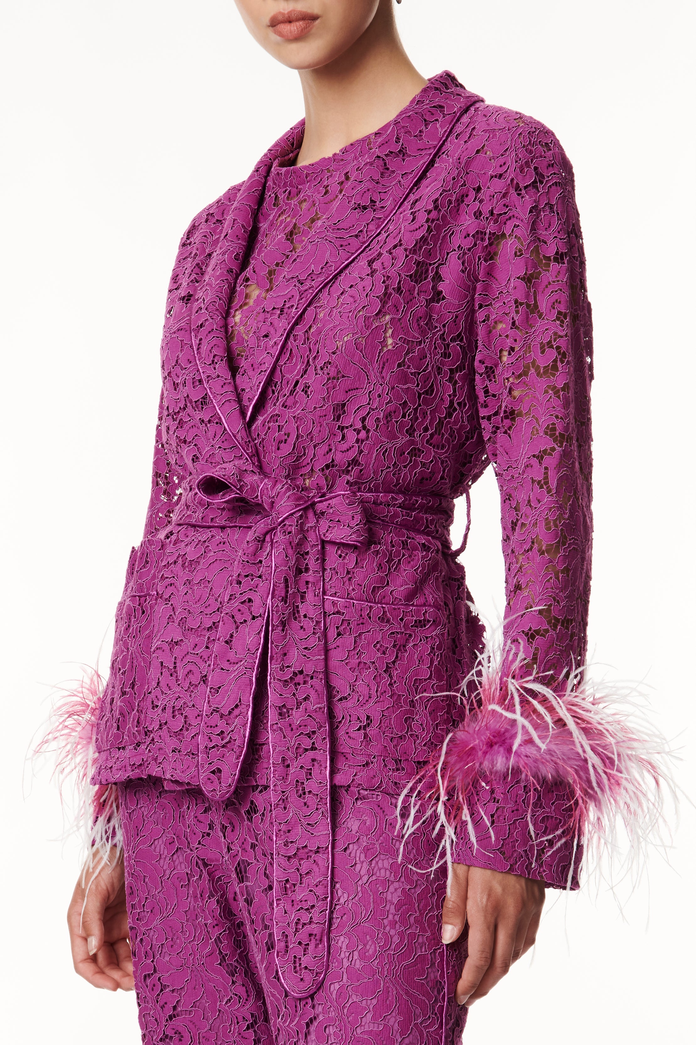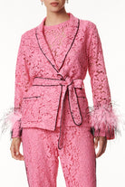 Un eleganza raffinata il kimono corto in pizzo, un capo che incarna la fusione perfetta tra femminilità e sofisticatezza. Realizzato con pregiato pizzo, che conferisce un tocco delicato e polsini arricchiti con piume tono su tono per un'aggiunta di originalità. Presenta una cinta in vita per sottolineare la silhouette rifinita con dettagli esclusivi, questo capolavoro di stile è perfetto per chi cerca un look raffinato e unico. Ideale per varie occasioni, dalla serata elegante a un'uscita informale, offrendoti versatilità e stile.