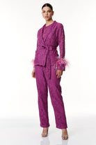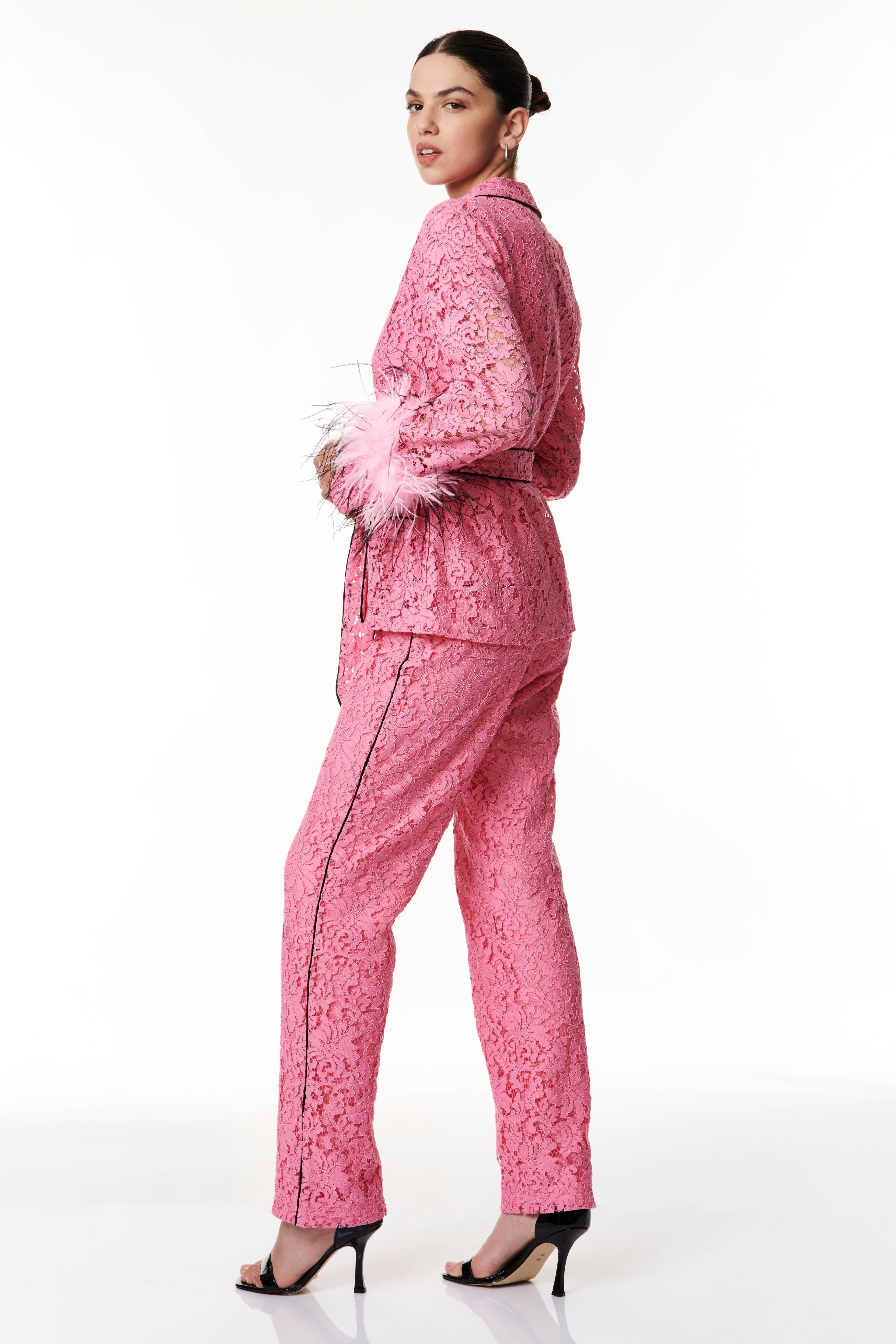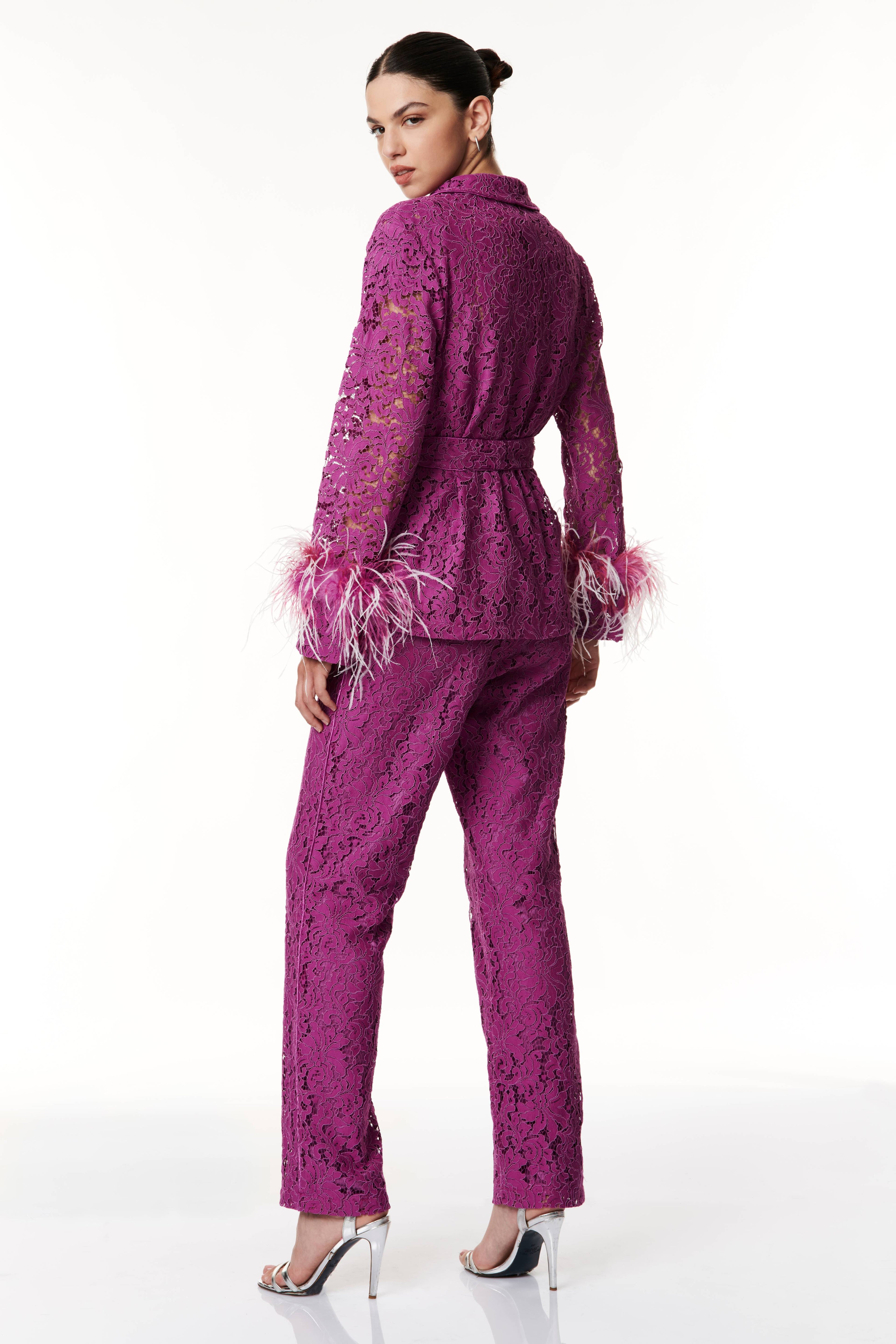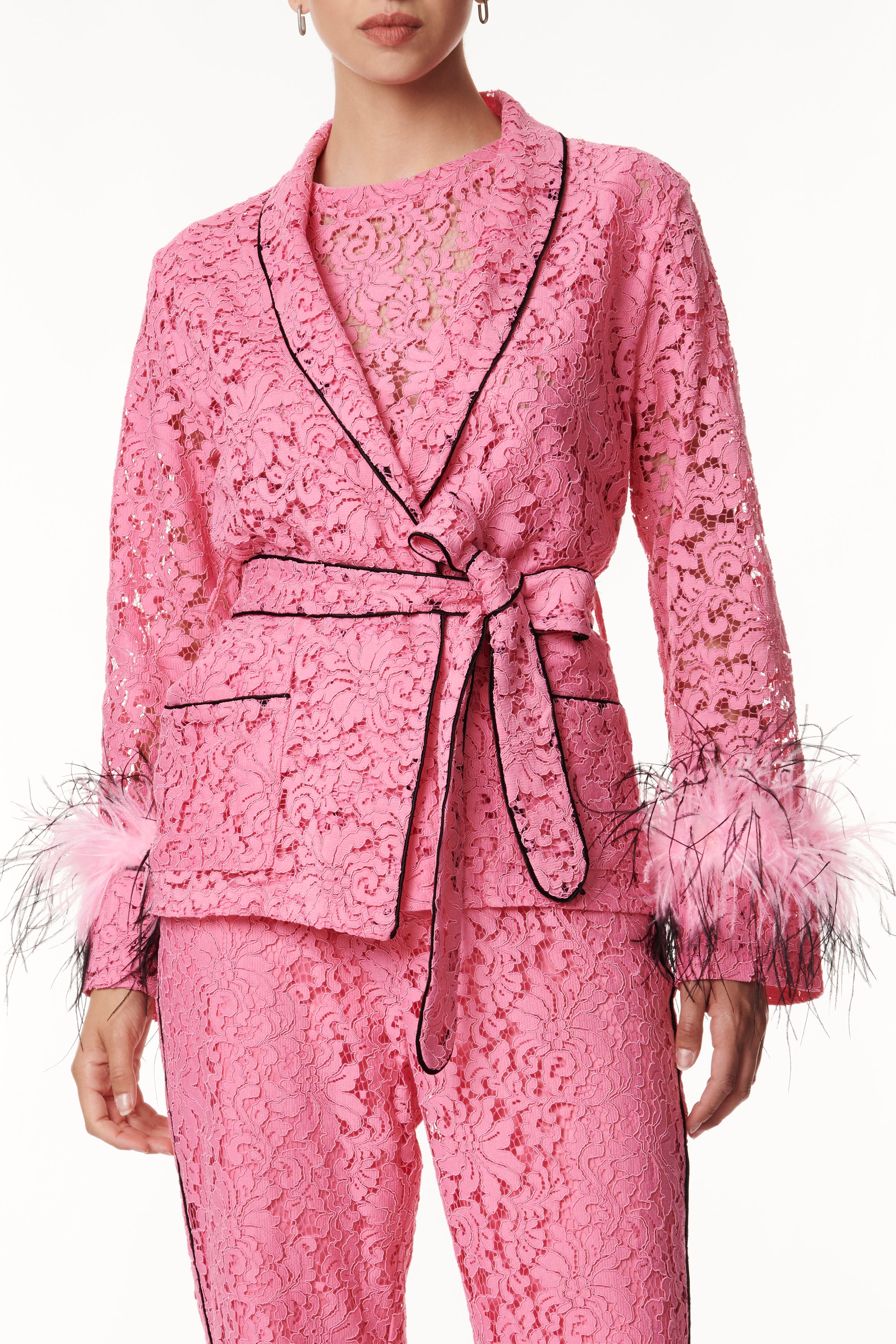 Un eleganza raffinata il kimono corto in pizzo, un capo che incarna la fusione perfetta tra femminilità e sofisticatezza. Realizzato con pregiato pizzo, che conferisce un tocco delicato e polsini arricchiti con piume tono su tono per un'aggiunta di originalità. Presenta una cinta in vita per sottolineare la silhouette rifinita con dettagli esclusivi, questo capolavoro di stile è perfetto per chi cerca un look raffinato e unico. Ideale per varie occasioni, dalla serata elegante a un'uscita informale, offrendoti versatilità e stile.