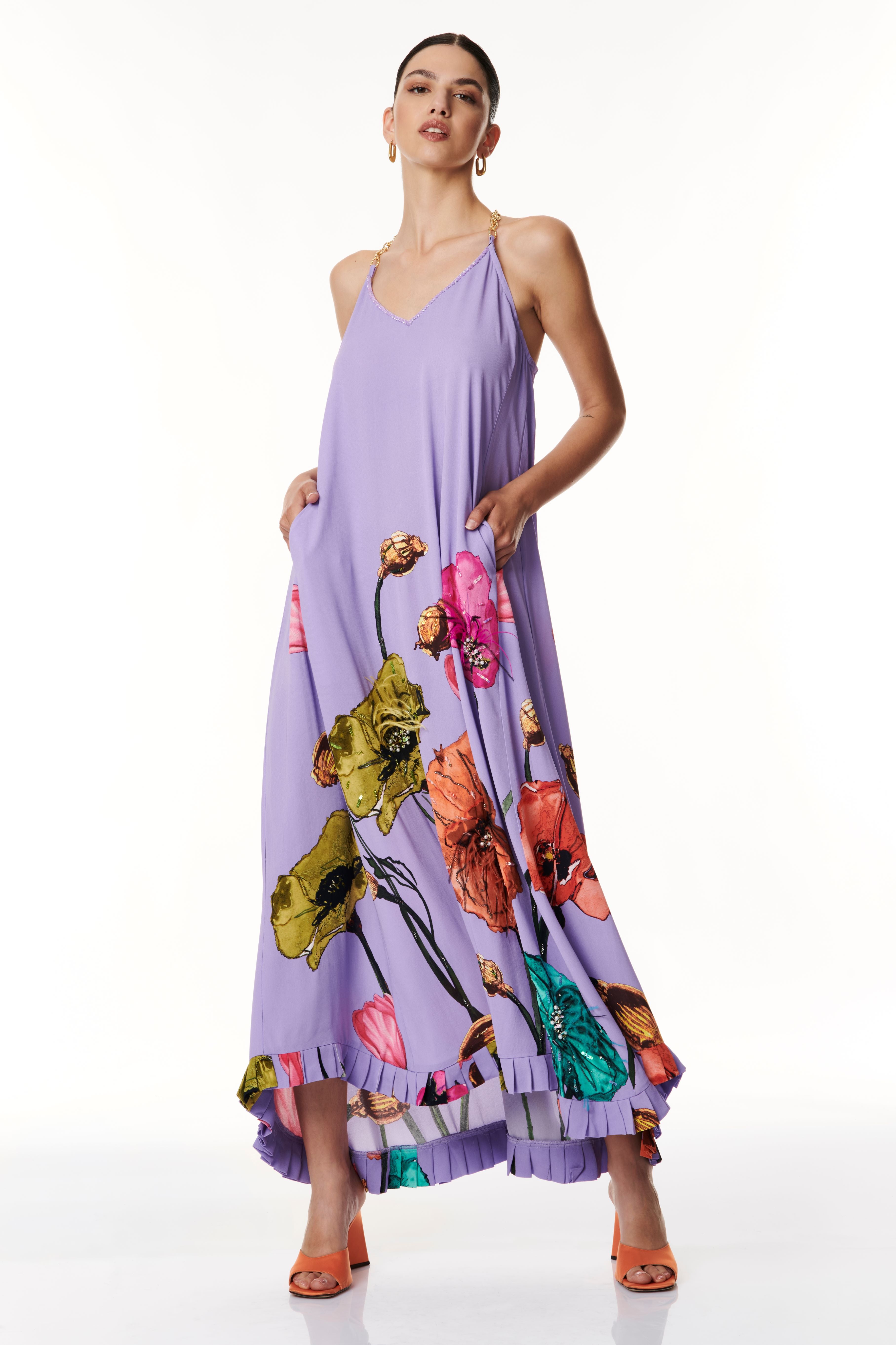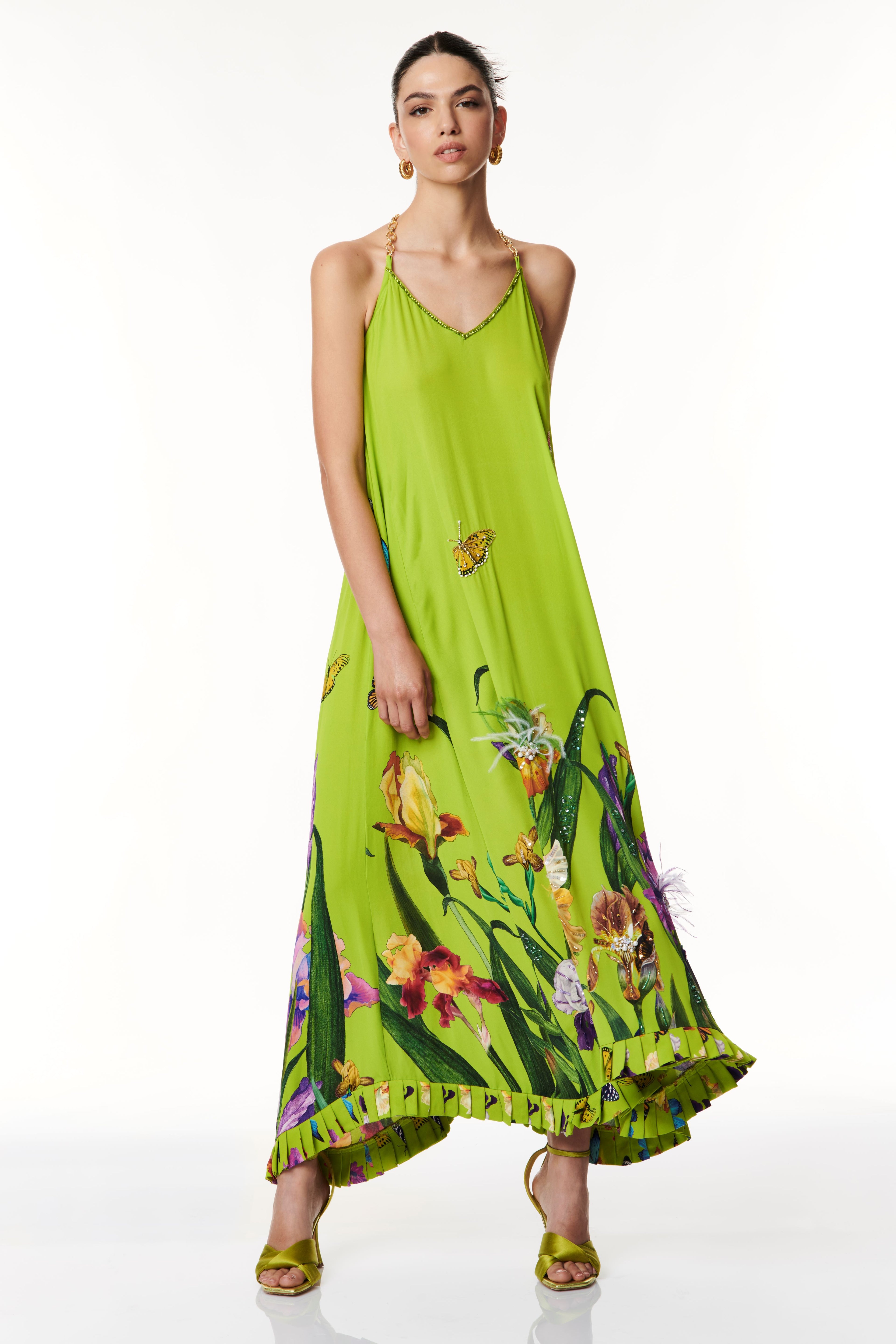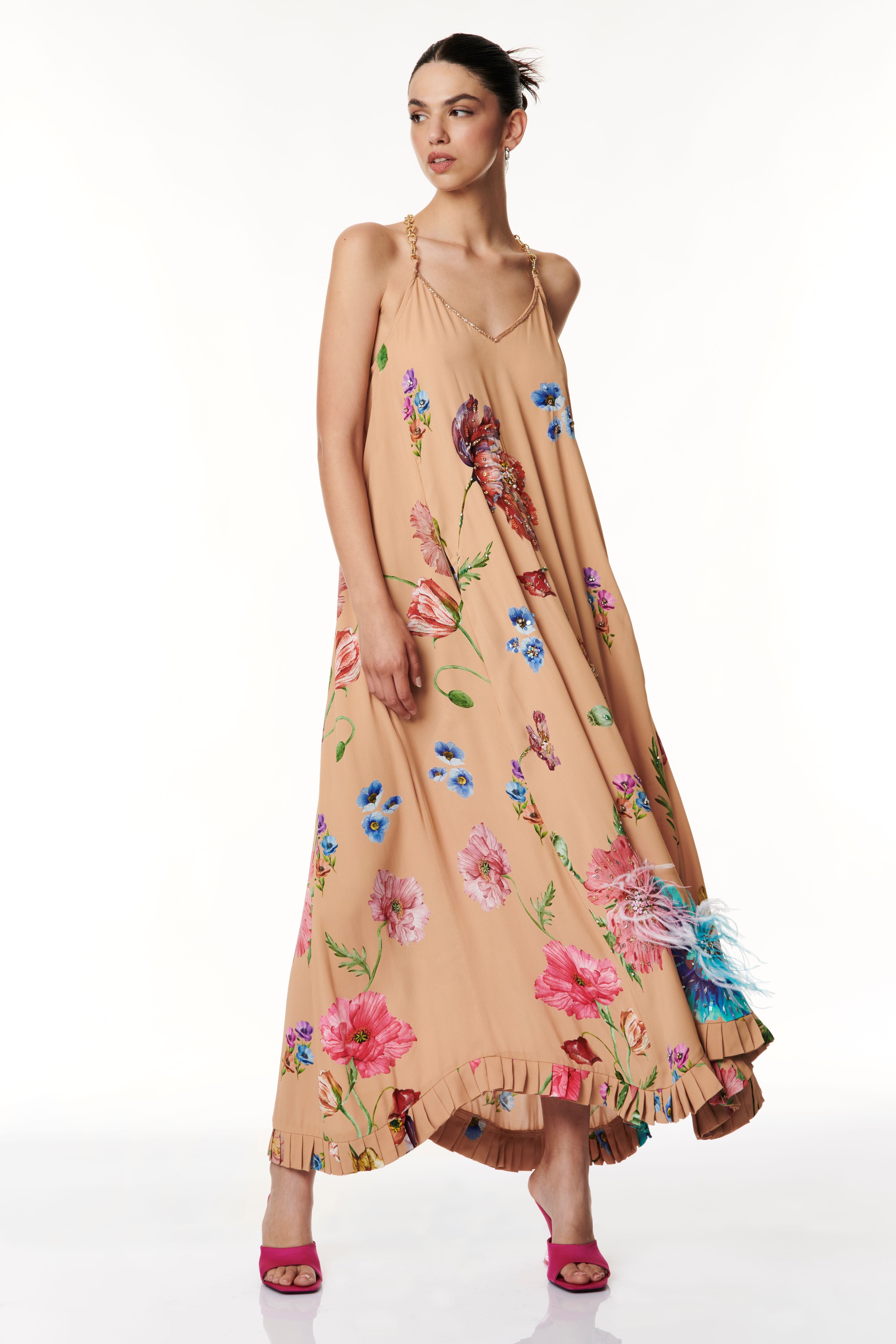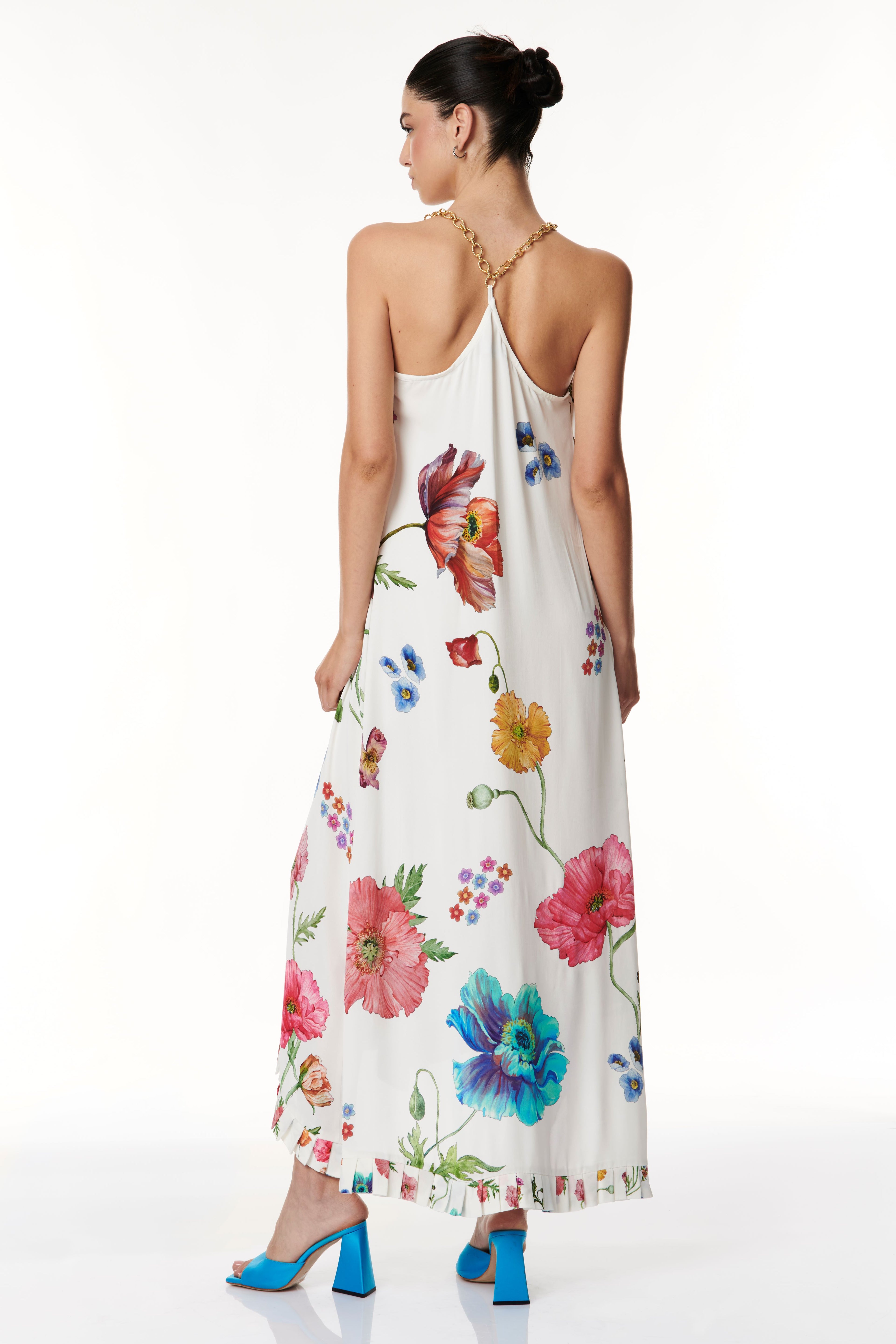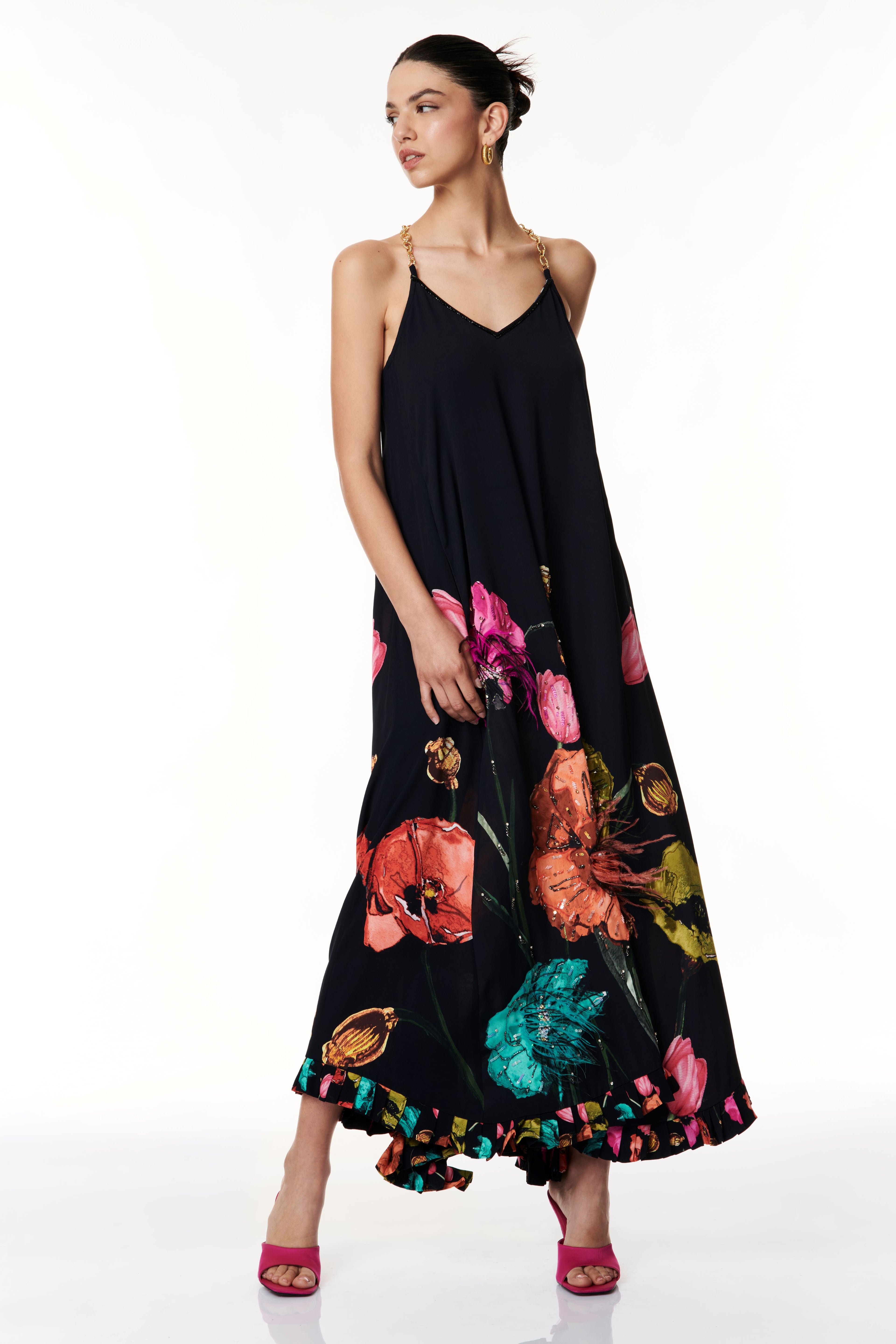 Risplendi in ogni occasione con questo lungo abito, un capo che incarna l'eleganza e la sofisticatezza. Le bretelline a catena oro aggiungono un tocco di lusso e raffinatezza, creando un contrasto accurato. Ricco di dettagli ricamati, creano un affascinante effetto tridimensionale rendendo il capo unico. Il design ampio dell'abito assicura anche il massimo comfort durante ogni occasione.
