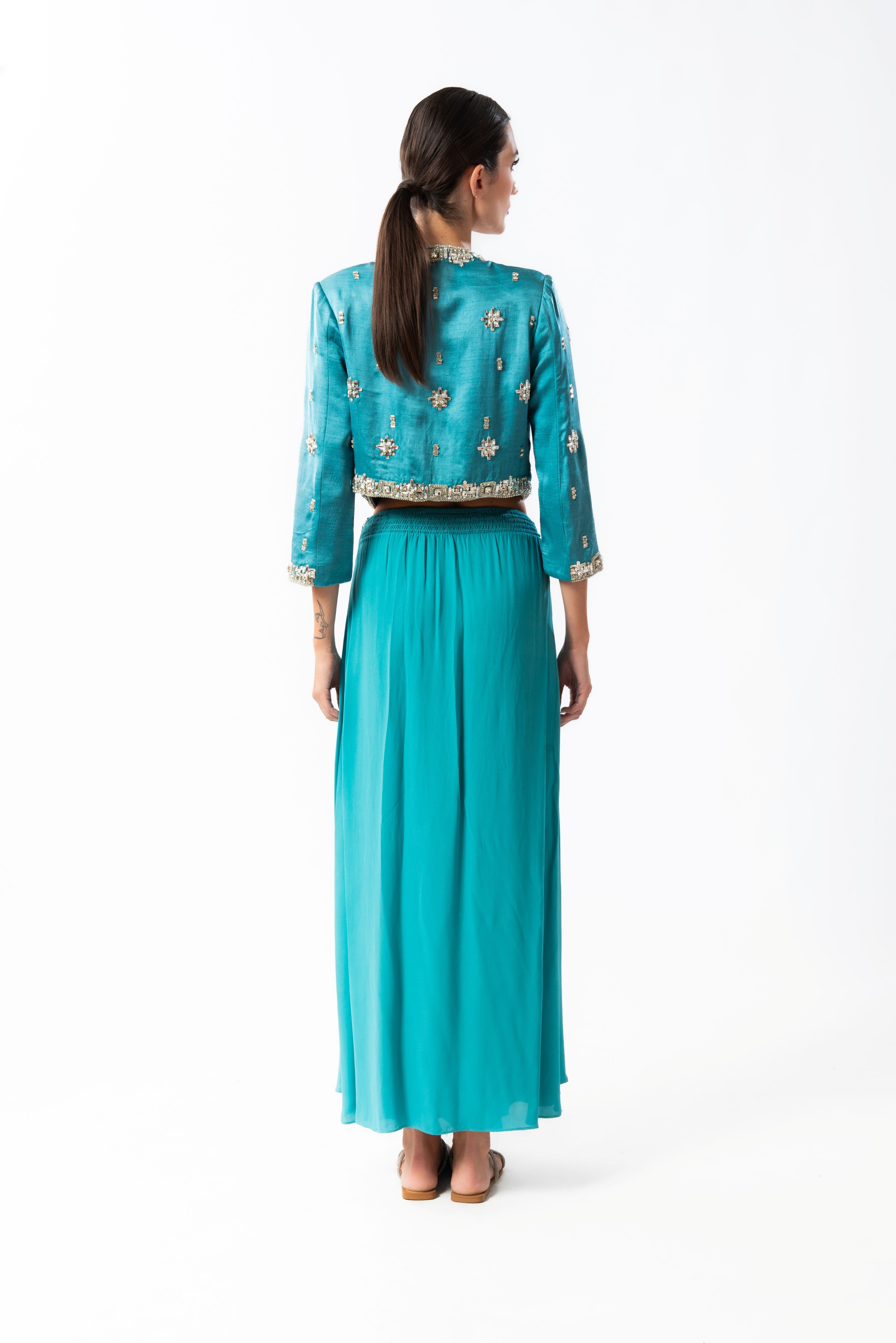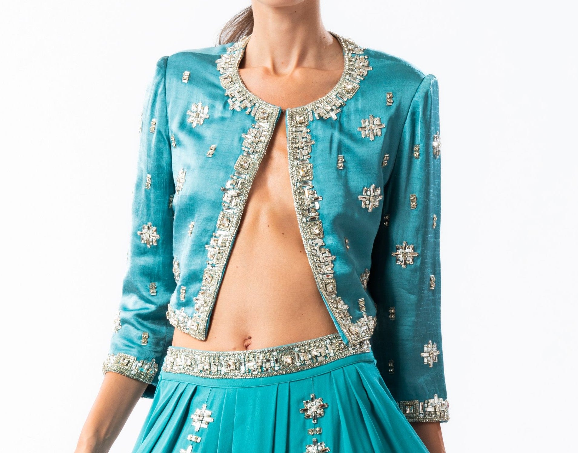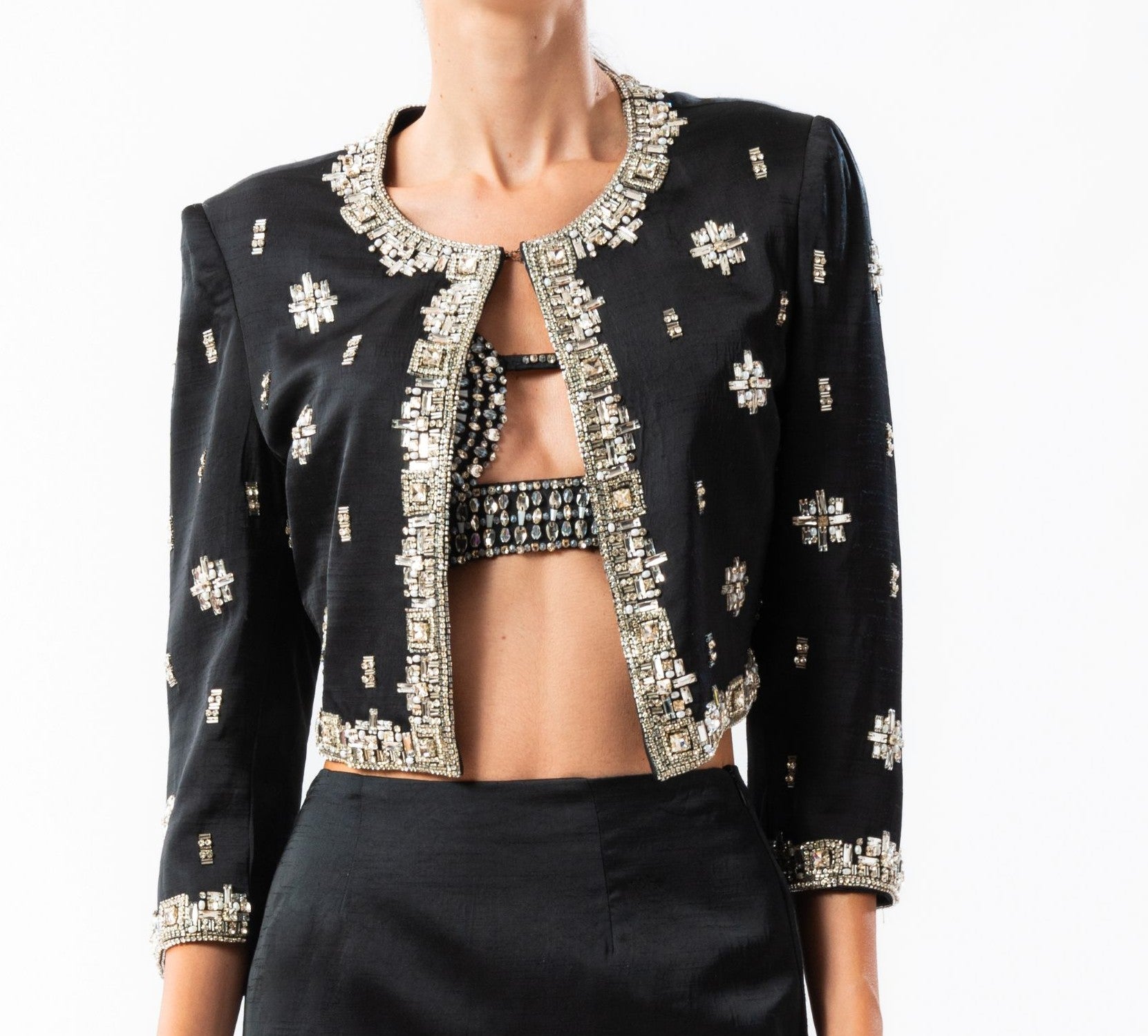 Scopri l’eleganza senza tempo con questa giacca corta, realizzata in un pregiato tessuto shantung e arricchita da ricami gioiello handmade. Questo capo esclusivo combina l’artigianalità più raffinata con un design sofisticato, perfetto per chi desidera distinguersi con classe. Con spalle leggermente strutturate e maniche a tre quarti, segue armoniosamente le linee del corpo per un fit elegante e femminile.